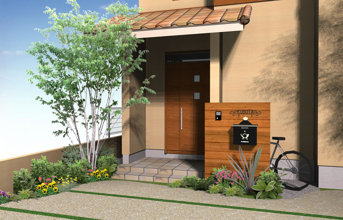 ダイニング前は庭を一番有効活用出来るウッドのテラスにする事で室内空間がグンッと広がります。また、木製フェンスはデッキ上で座わると道との視線を遮る高さに設定しています。軽自動車の駐車スペースは、庭との一体感を出すために芝生敷きに。敷地コーナー部は、つる性植物を植え込み、将来的に緑の壁をつくる様にしています。