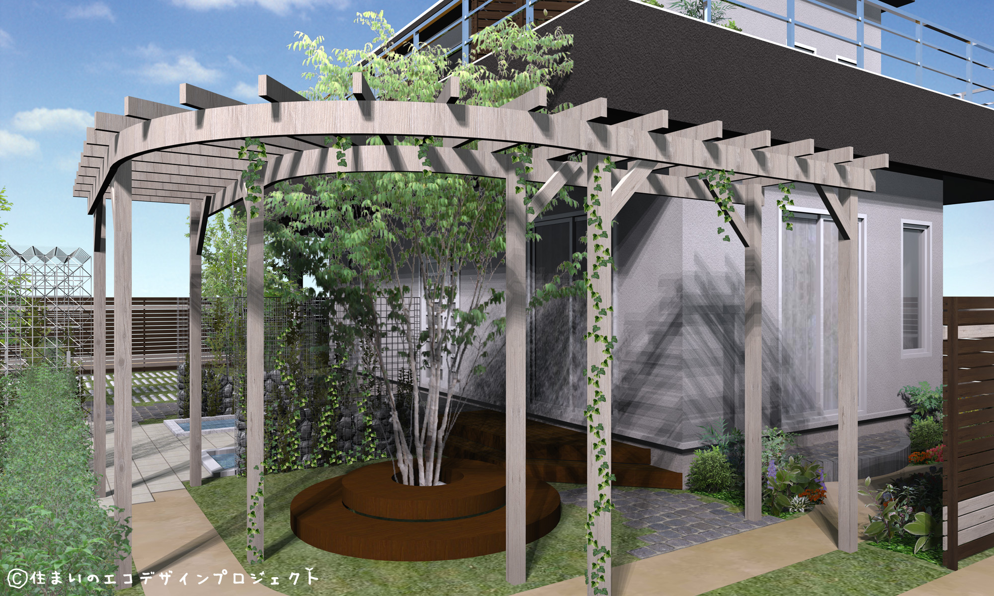 樹木は大気中の二酸化炭素と、根から吸収する水が栄養となり、太陽の光を浴びて酸素を作ります。木材の重量のおよそ1/2が炭素とも。だから1戸でも多くの住宅に1本でも多くの樹木を植える事ができるなら…、相当な量の二酸化炭素を固定化できる事でしょう!屋根には屋上緑化。パーゴラ・緑化フェンスで木陰をつくり、毎日の生活を快適に過ごせたら、素敵ではないでしょうか。