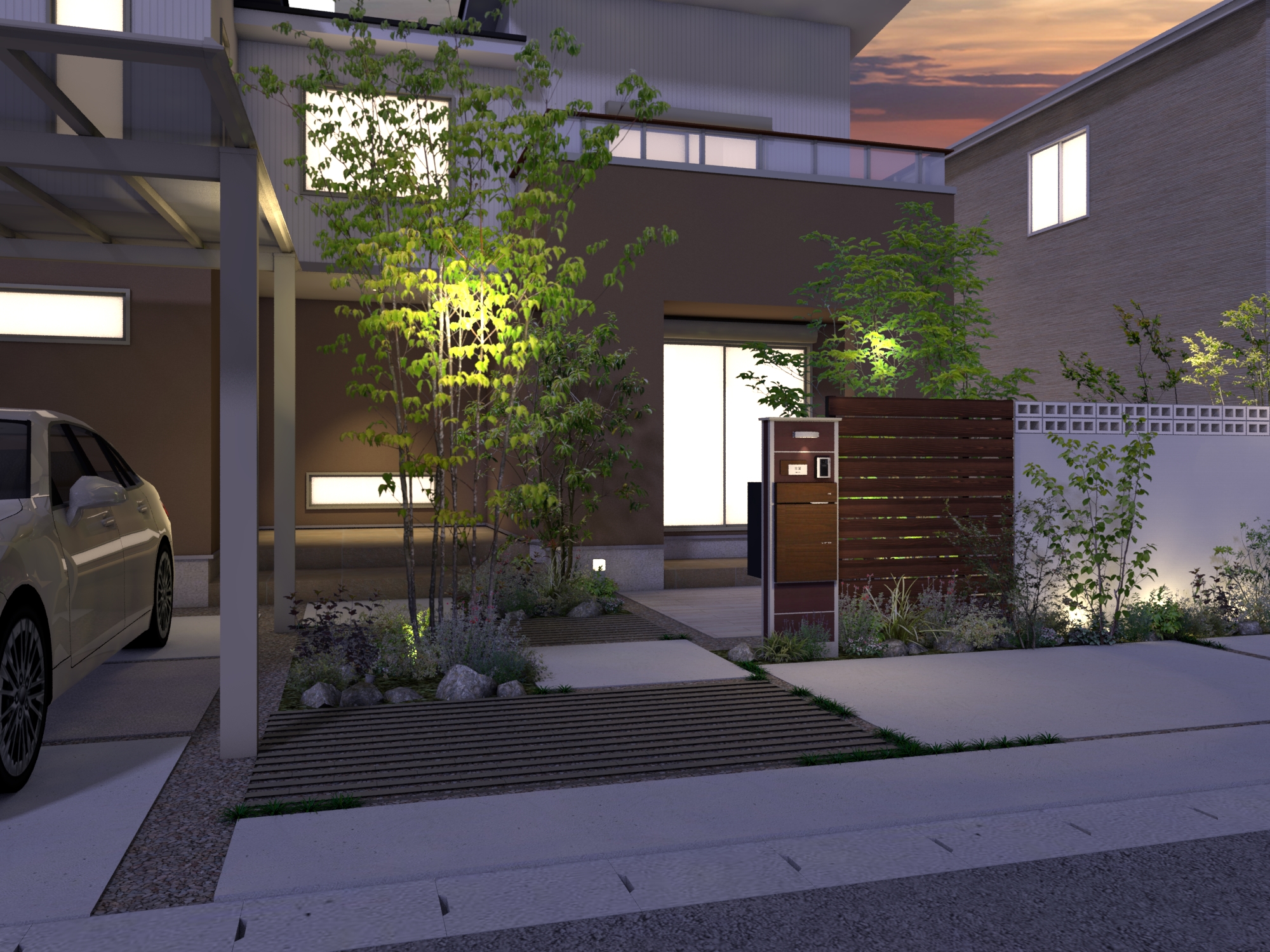 【デザインの説明】 ライティングを各所に設け彩ったオープンファサードです。 目隠しはフェンスと塗り壁を交互に用いることで、単調にならずデザイン性の高いものになります。