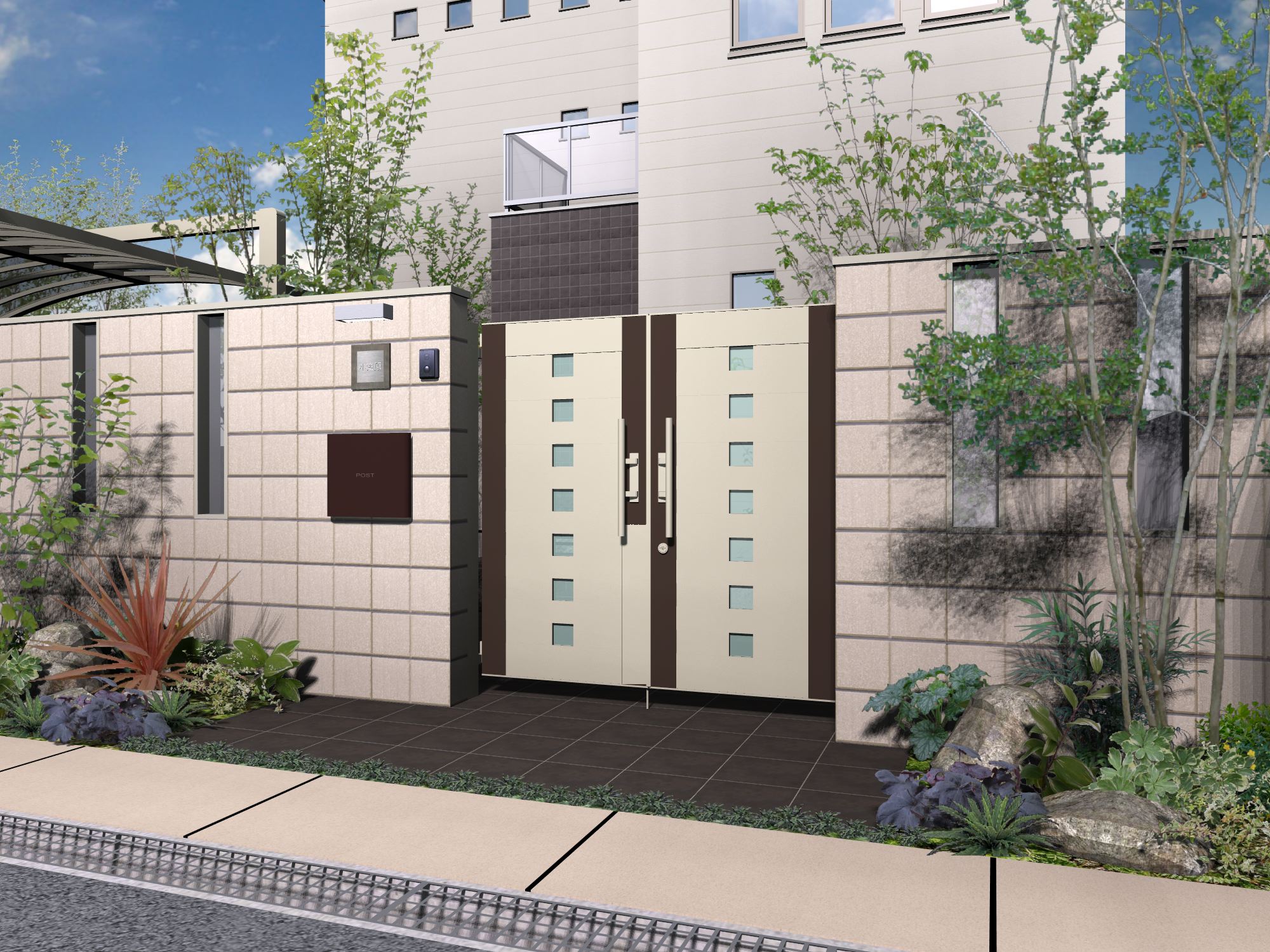 【デザインの説明】 大型の塀で囲われたセキュリティ重視の外構では面タイプの門扉で閉鎖感が出てしまうが、ワンポイントでポリカの窓を取り付けた5型と美ブロフェンスで光を取り入れます。