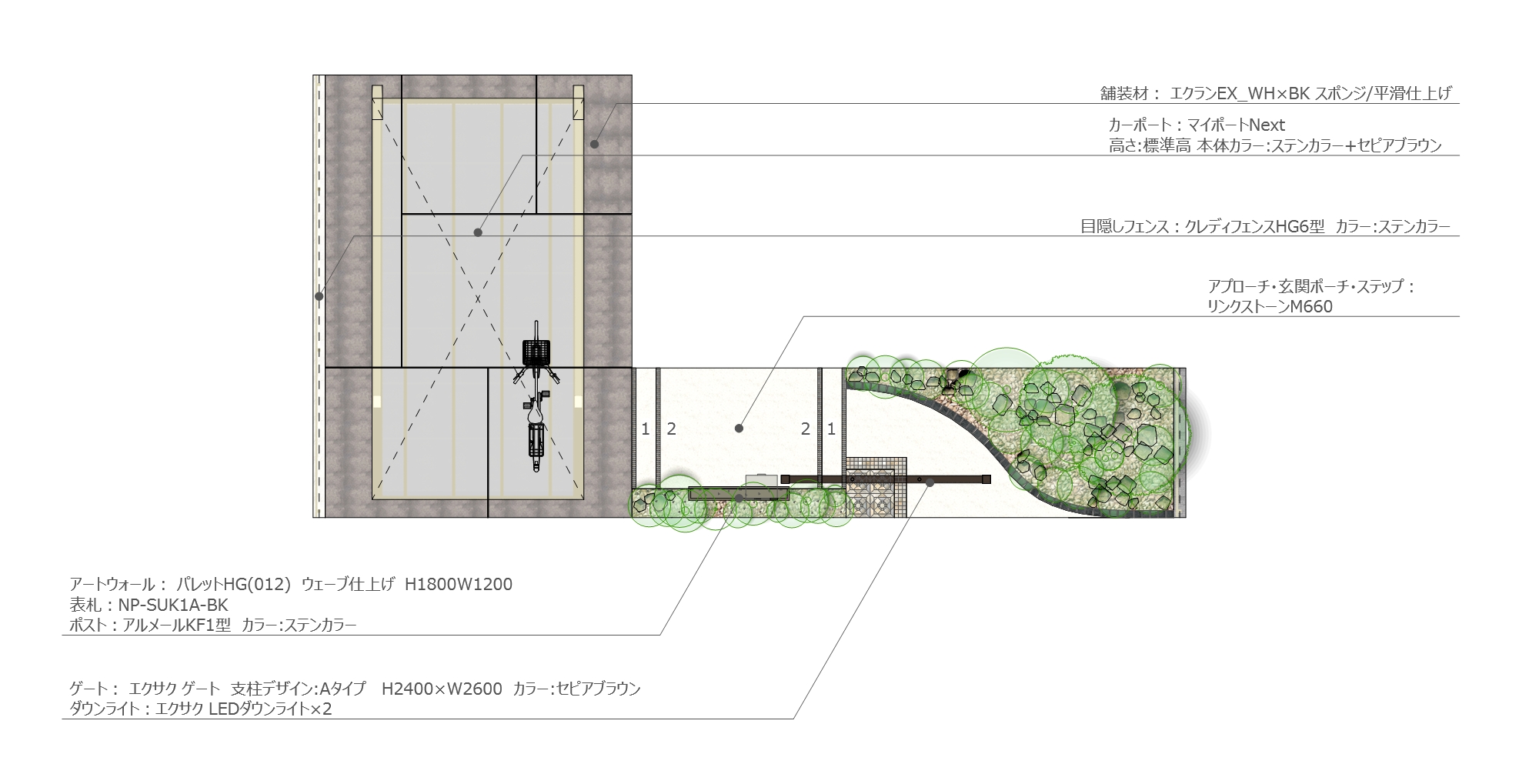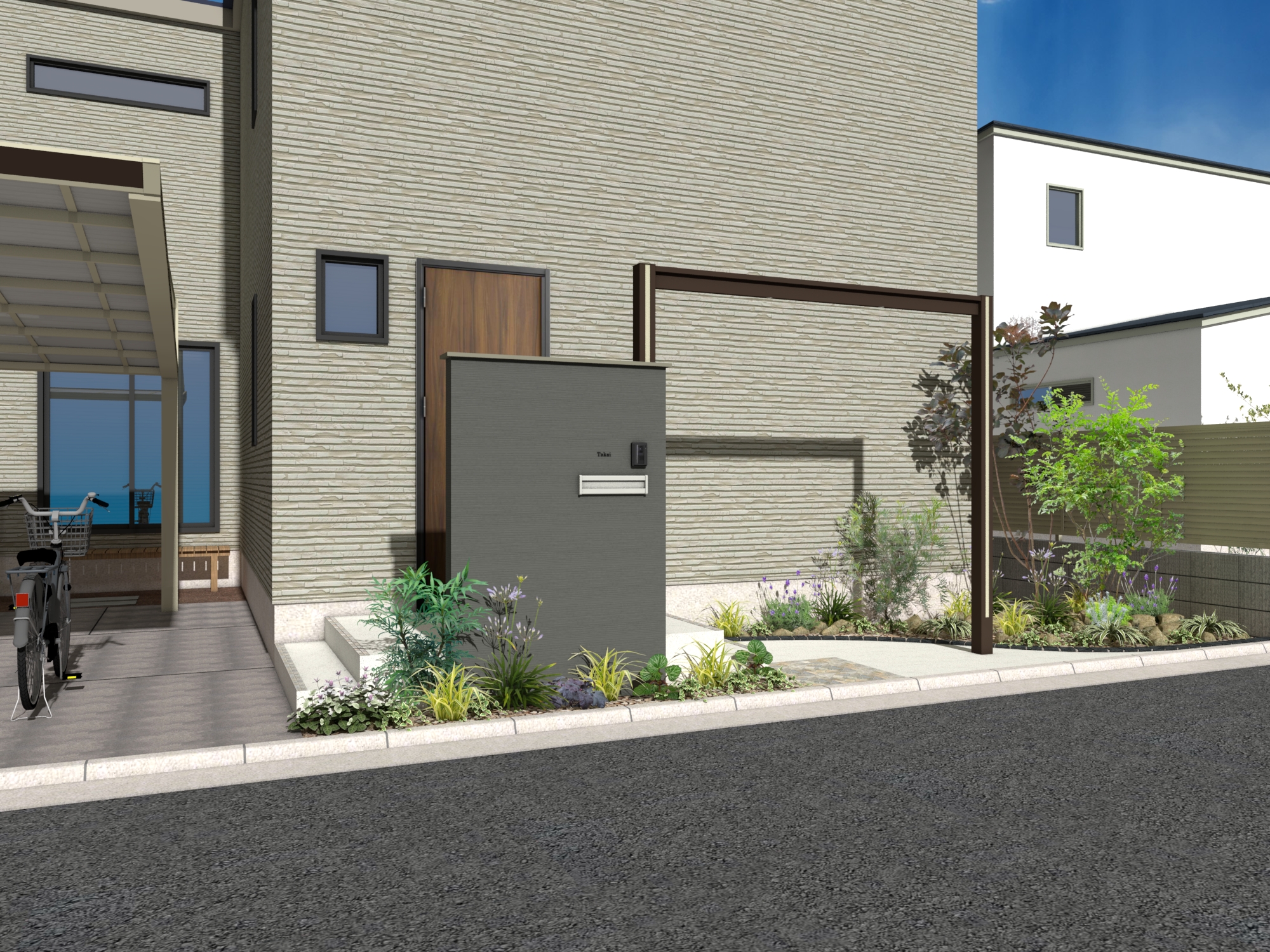 アートウォール seed は、道路からの視線を適度に遮りながら、玄関前に落ち着いたプライベート感を生み出す存在として配置。高さを抑えた設えとすることで、圧迫感を避けつつ、ファサード全体の重心を安定させています。