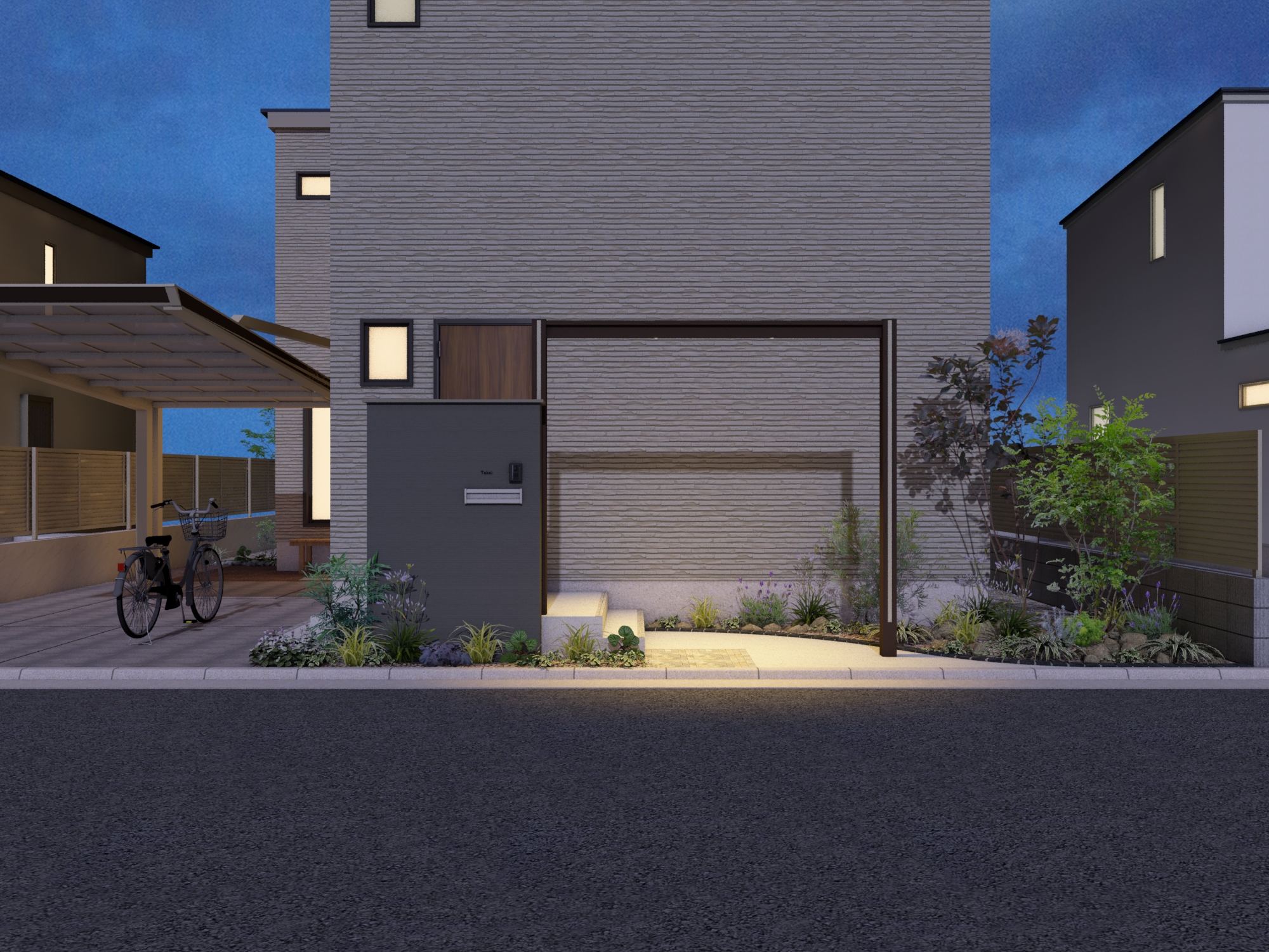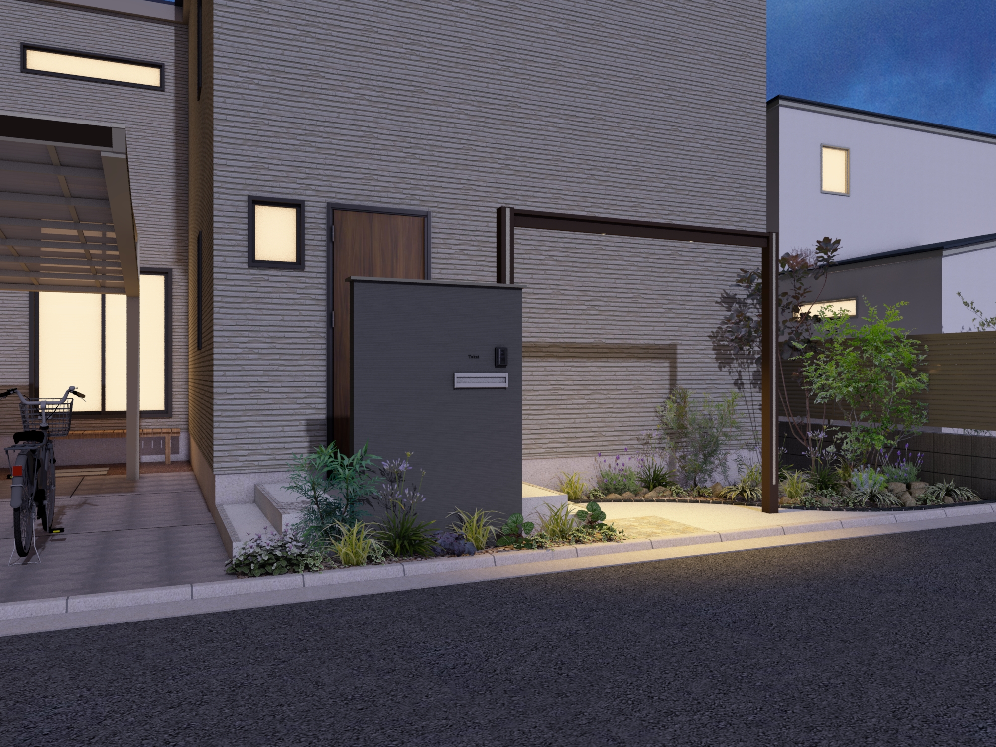 帰宅時には自然と視線が玄関へ導かれ、「迎え入れられるような安心感」を感じられるアプローチ空間となっています。