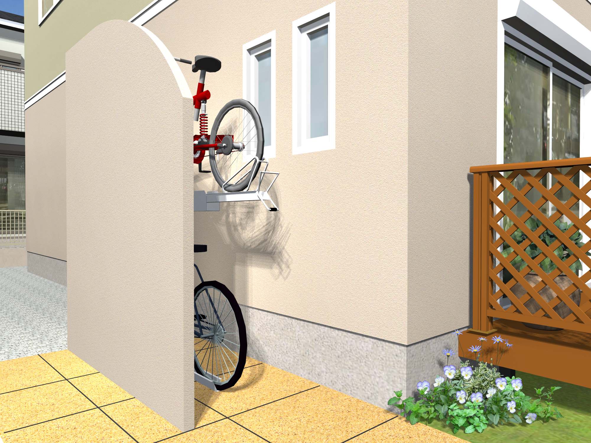【デザインの説明】 アートウォールのパネル厚60㎜と2段式サイクルラックを 活用して、自転車をすっきり収納するプラン。