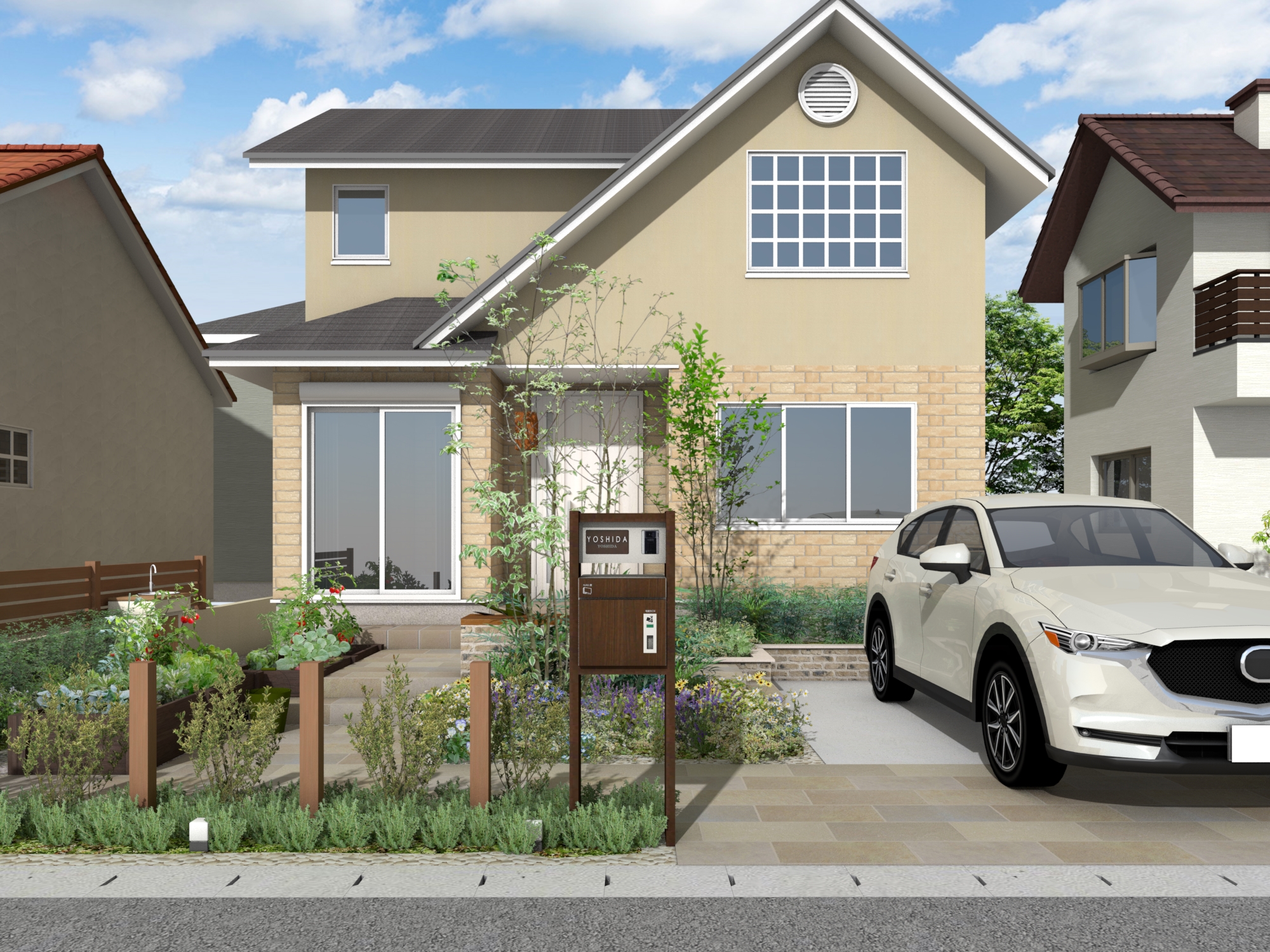 【デザインの説明】 門柱に必要な表札・インターホン・郵便ポスト・宅配ボックスの、すべての機能を詰め込みました。 インターネットで注文したガーデン用品の受取時間を気にすることなく、いつでも外出できます。 自分時間を楽しむための菜園で、育てた食材を収穫して家計にやさしく、健康な生活を実現できます。