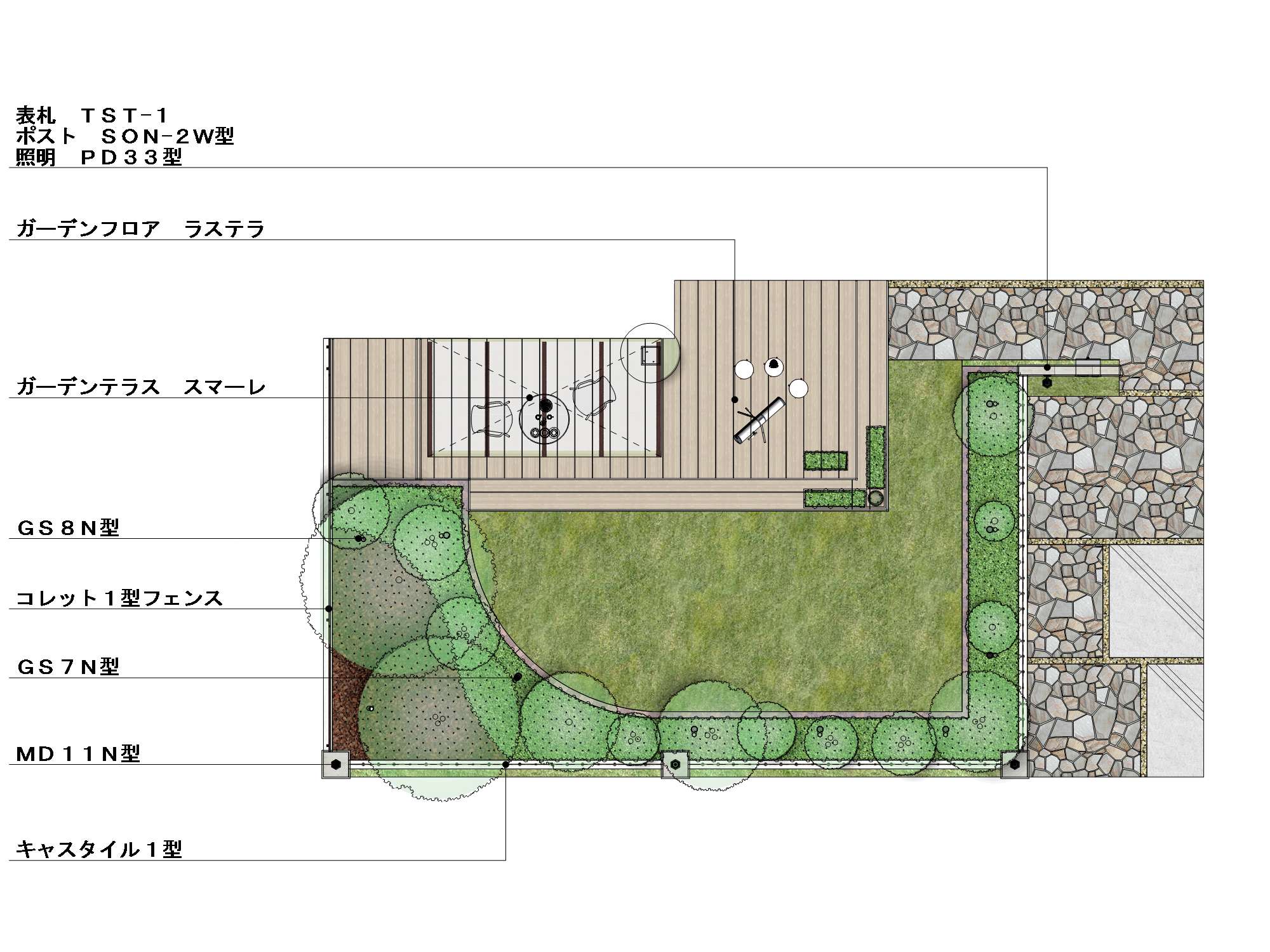 住宅壁一面に広がり、どの部屋からでも気軽に外へ出れる屋外フローリングのような「ラステラ」デッキのある、ナチュラルな庭まわりです。屋根付きのプライベートスペースにはサイドオープンタイプの「スマーレ」で家の中へ光を取り入れることができ、室内から続くような開放感のある空間をつくります。庭の境界まわりに沿って作られた花壇が街並みに潤いをもたらし、季節ごとに「キャスタル」フェンスから覗かせる色とりどりの花さわやかな緑が道行く人を楽しませます。