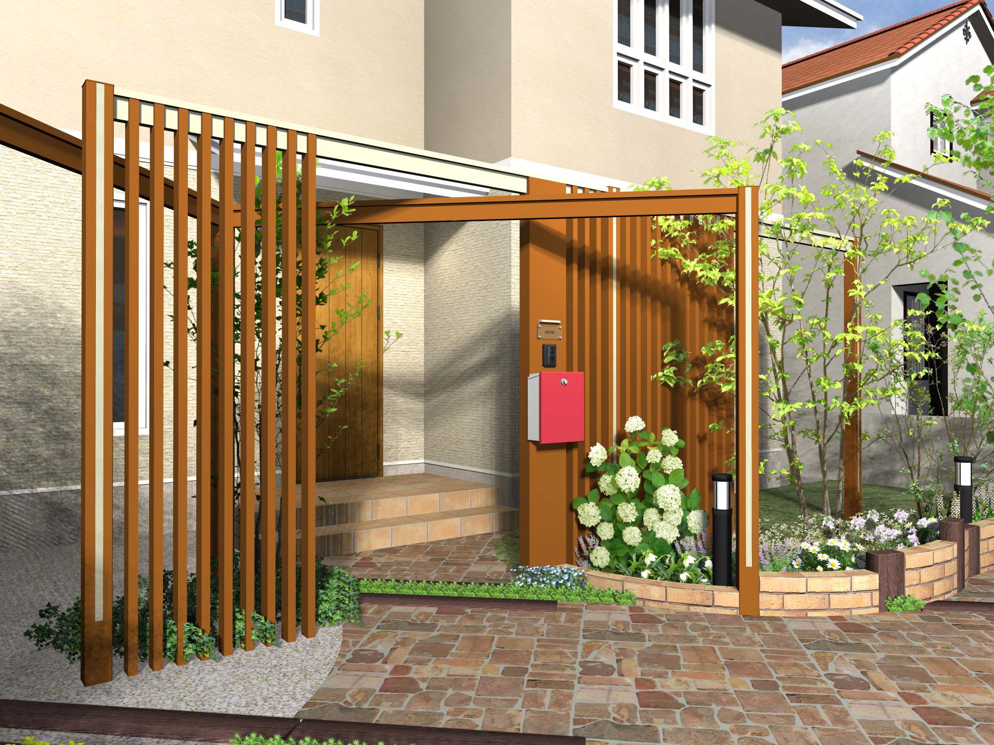 【デザイン説明】 連続した縦格子を玄関まわりに取り付けたゲートと、斜めに配置したゲートを立体的に交差させることで、 プライベート空間の境界をより強調させたプラン。ビビッドな茜色のポストがアクセントカラーとして効果的です。