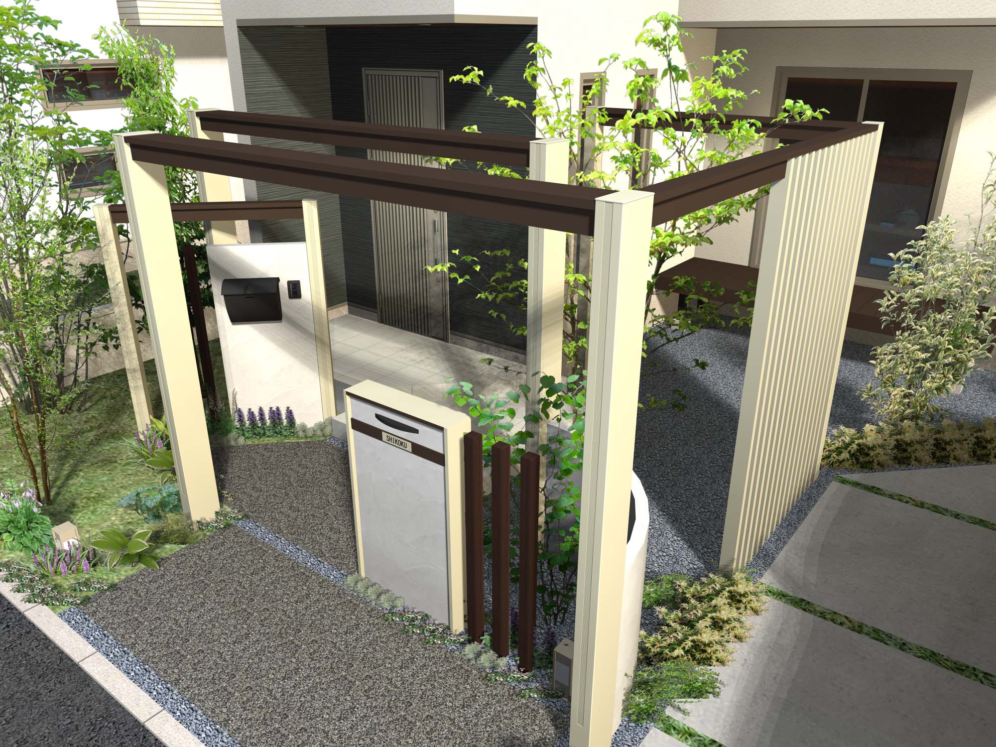 【デザイン説明】 柱の太さが異なる複数のゲートを組み合わせたり、一部のゲートと飾り塀を斜めに配置するなど、 限られた玄関前スペースに奥行きと広がりを演出したプランです。