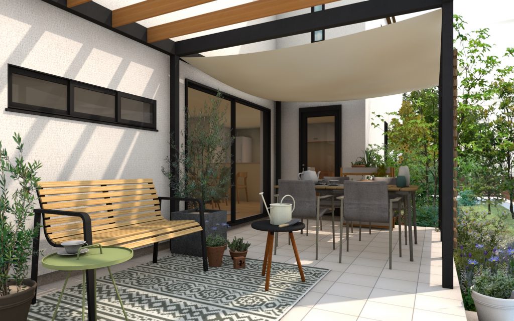 白い外壁に映えるブラックのフレームと天然木のスリット材の組み合わせは、まるで郊外の素敵なカフェで過ごしているような雰囲気。玄関ポーチとL字につながったテラスは、空間を広く見せ、庭での過ごし方の幅を広げます。休日にはダイニングテーブルで食事をとったり、お庭でハーブなどの植物を育てたり、ガーデニングの合間にはベンチで休憩したりと、あなたに癒やしを与えるとっておきの場所になりました。