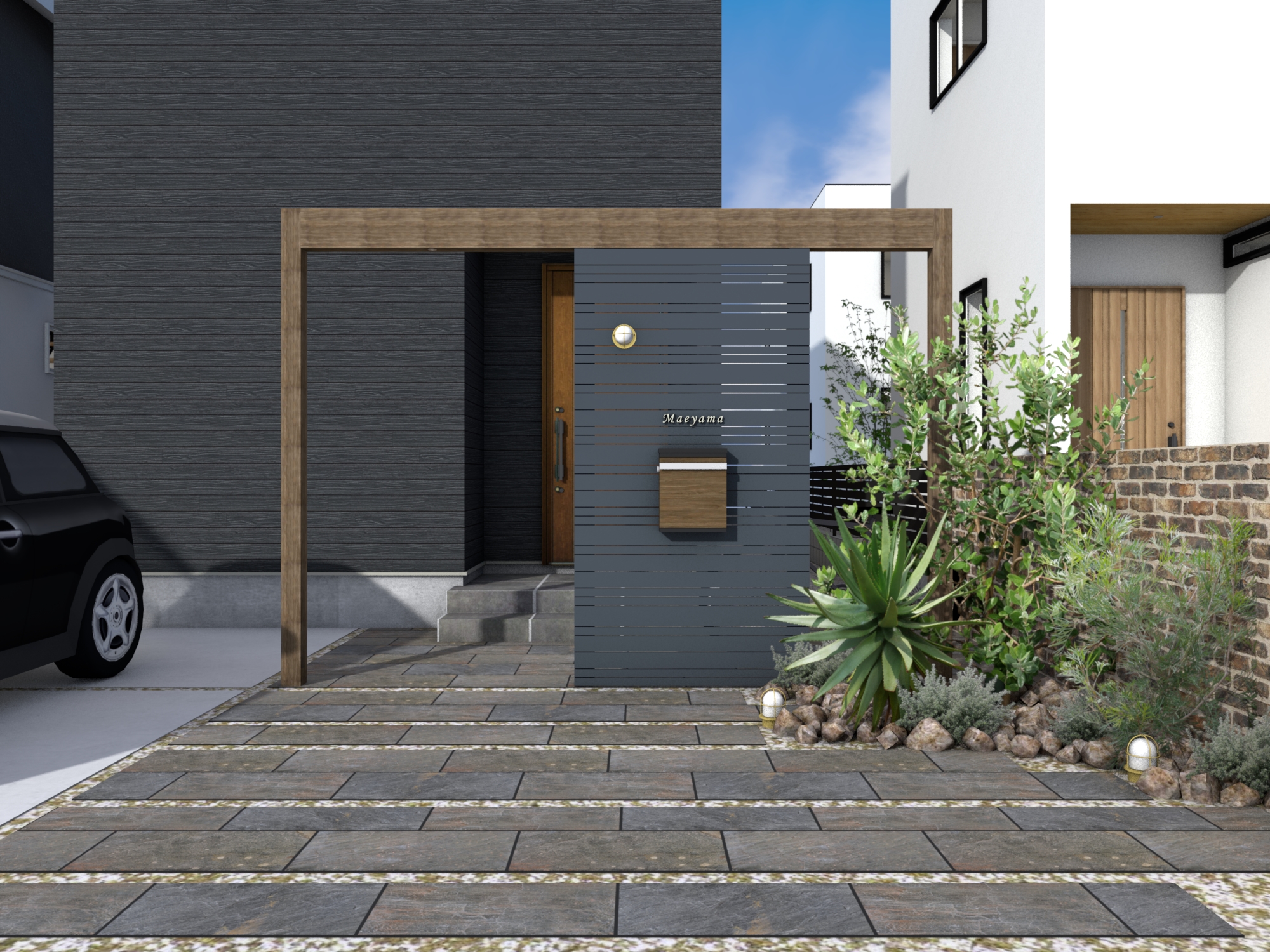 ホームプラン抜け感と目かくしが両立するフレーム付門柱