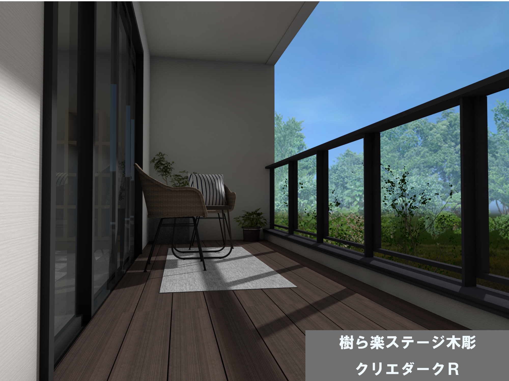 レストステージのみ展開していたベランダ仕様に、デッキDC・デッキDS・樹ら楽ステージ木彫・樹ら楽ステージのLIXIL人工木デッキ全商品がラインアップ。