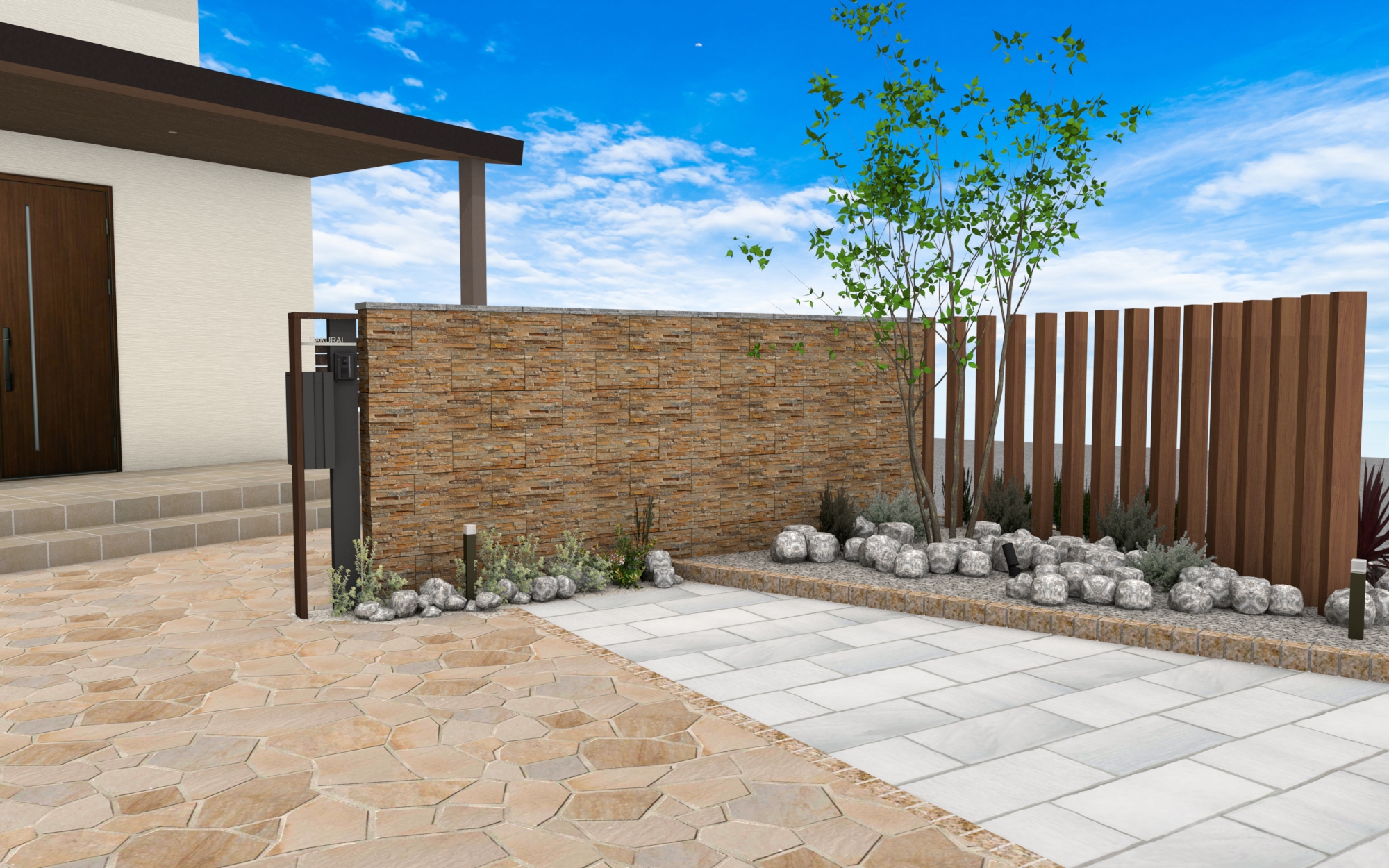 重厚感のあるデザインブロック「クライフボーダー」の壁体をファサードにひとつ設置するだけで、オブジェのような存在感を示します。クライフボーダー自体にポストなどを取り付けずにシンプルに壁体だけを見せるようにする事で、水平基調の伸びやかさが強調されたデザインとなっています。また、門柱やアプローチを建物に対して斜めに設置する事で、デザイン性をアップさせています。