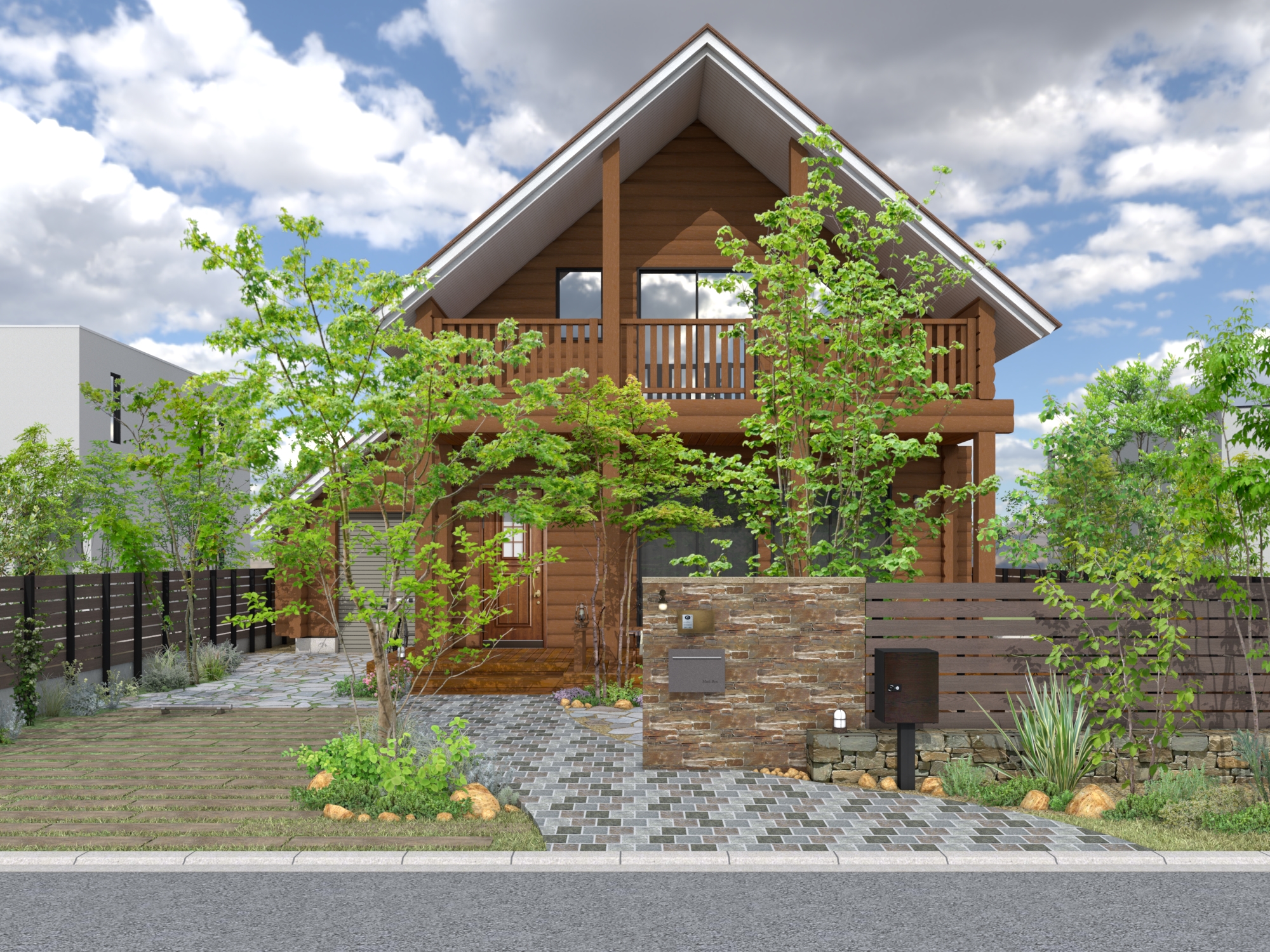 駐車場から庭への舗装には、軽量コンクリート製の枕木オンリースリーパーとアルデンヌ乱形の飛石を用いています。