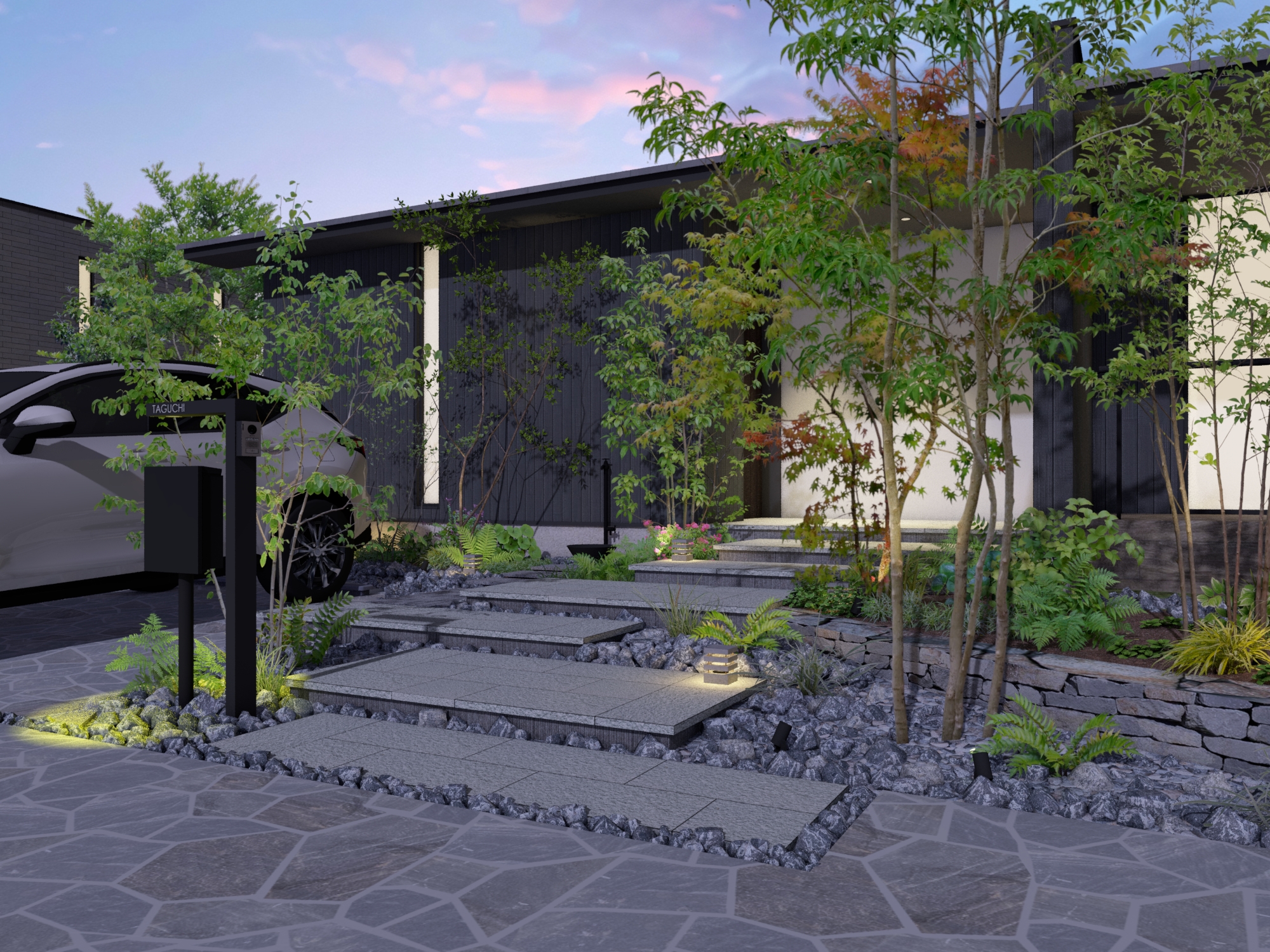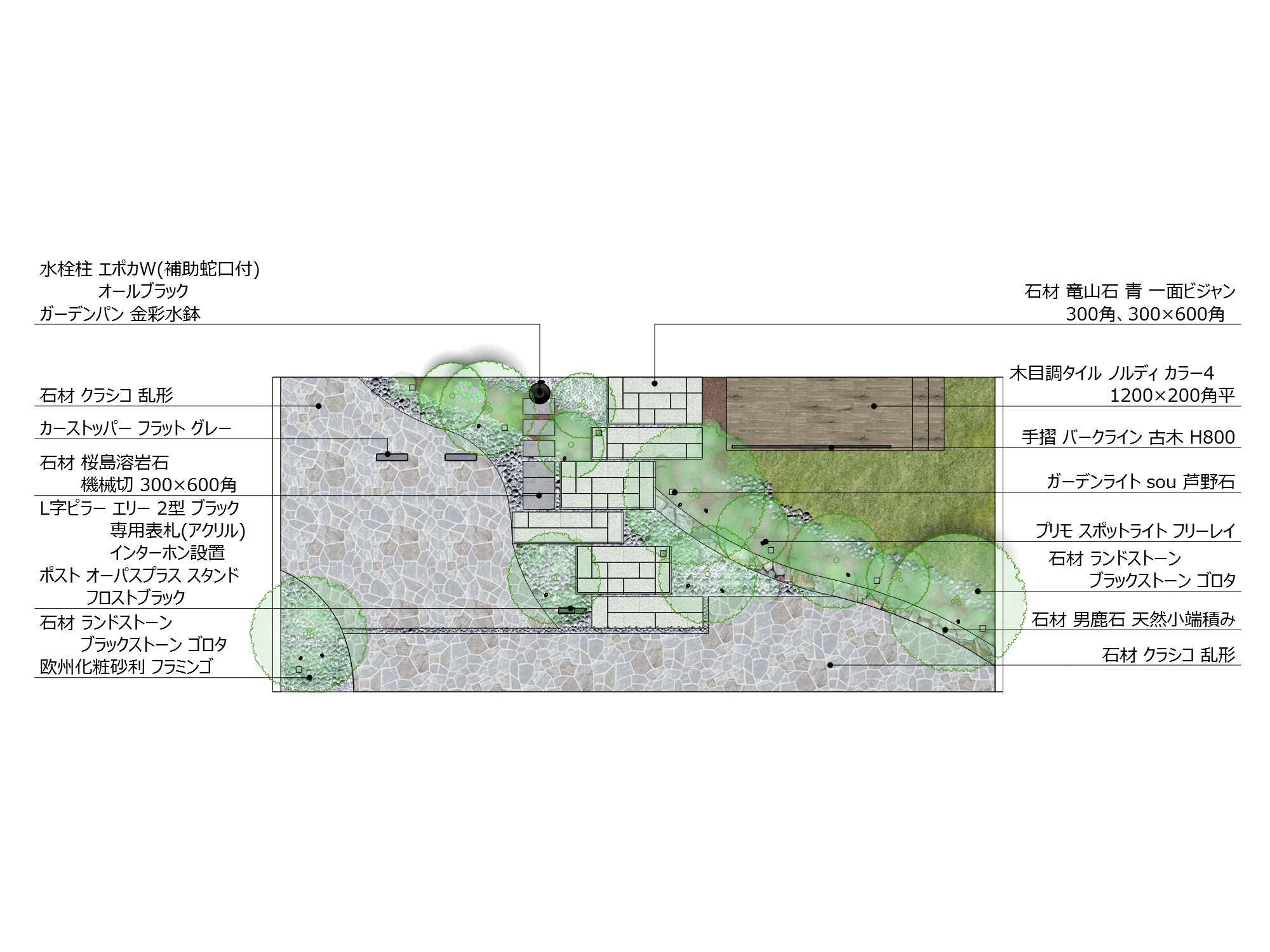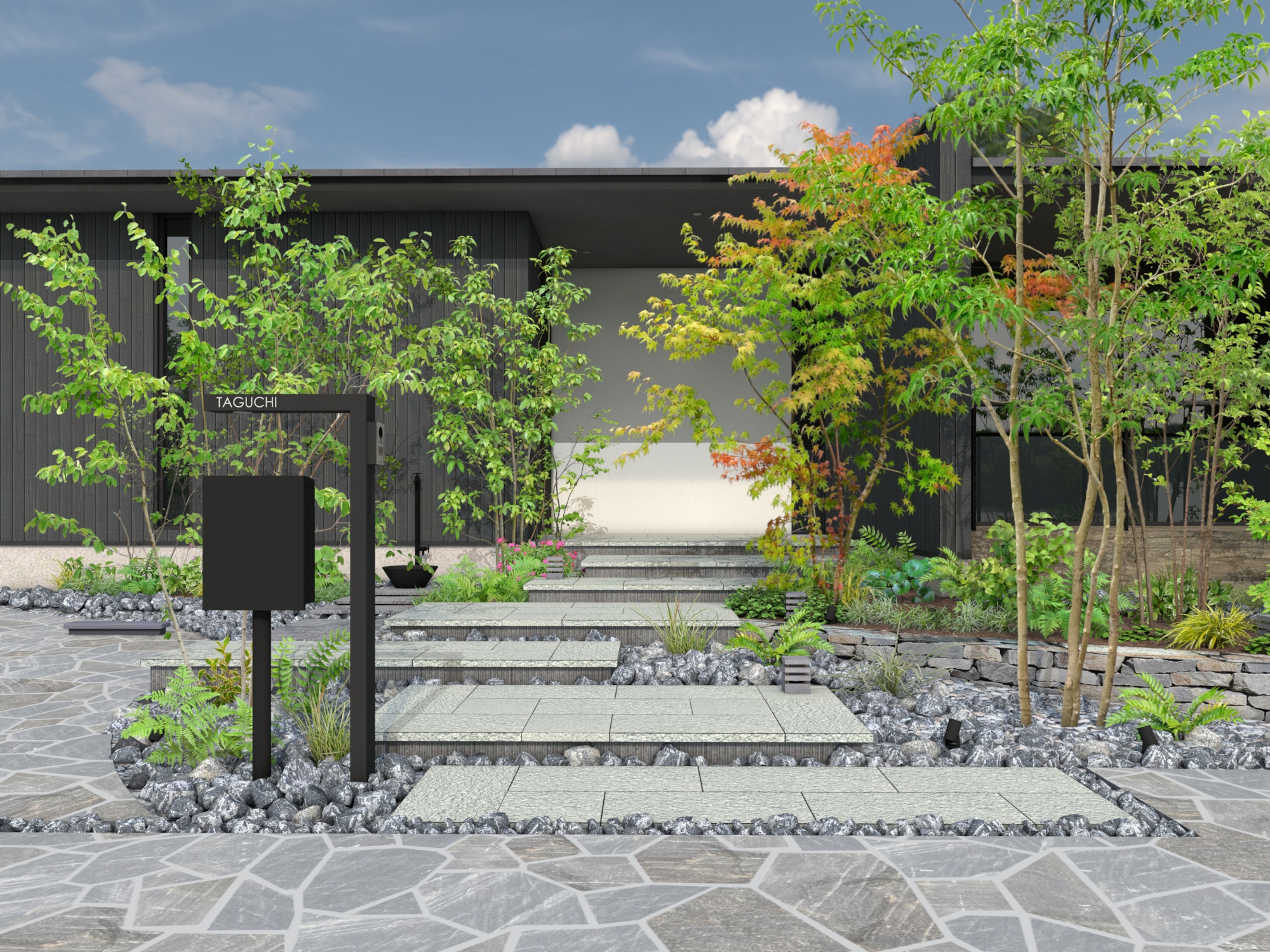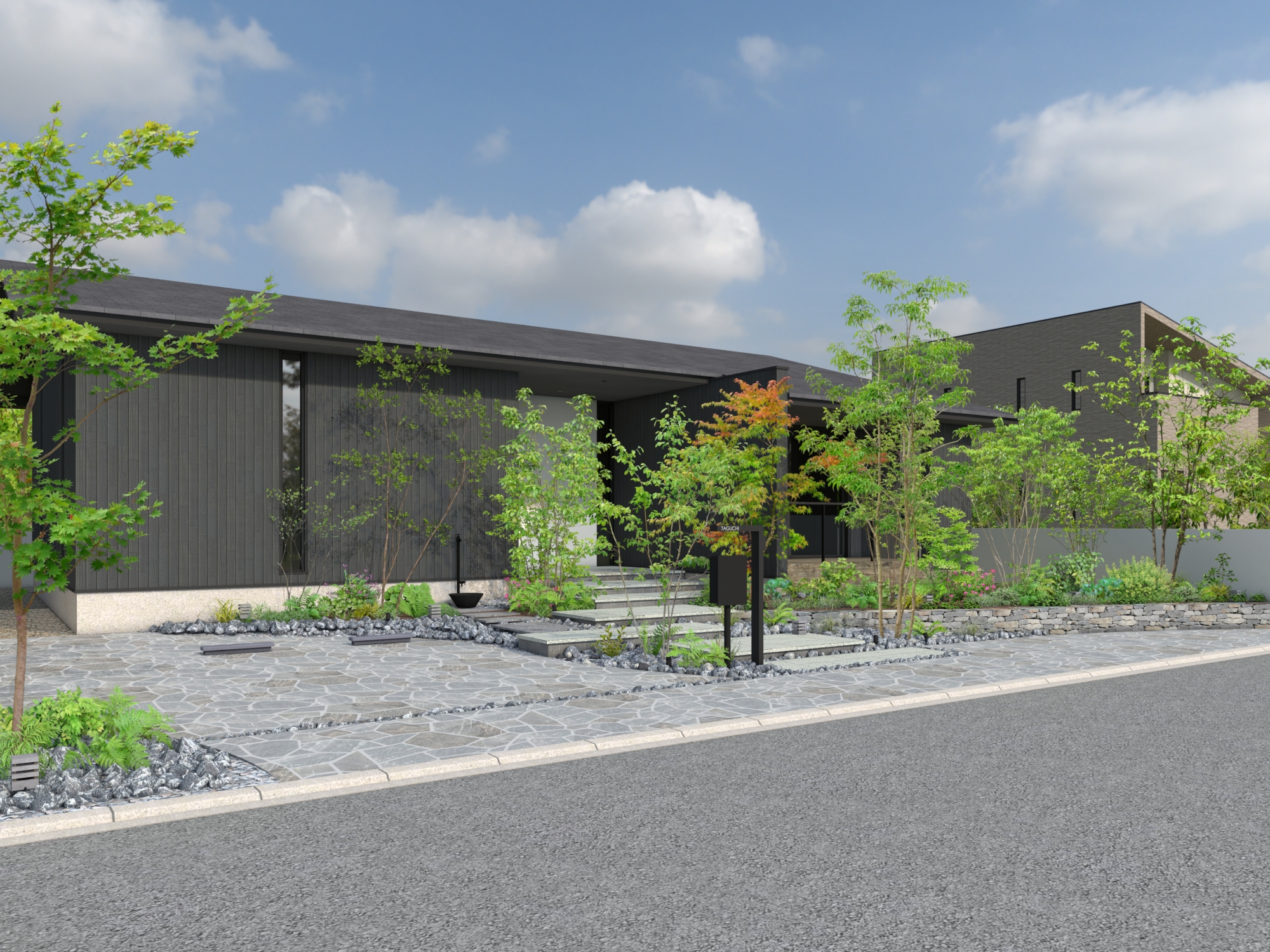周囲には「ランドストーン」ブラックストーンのゴロタ石と植栽を調和させ、
