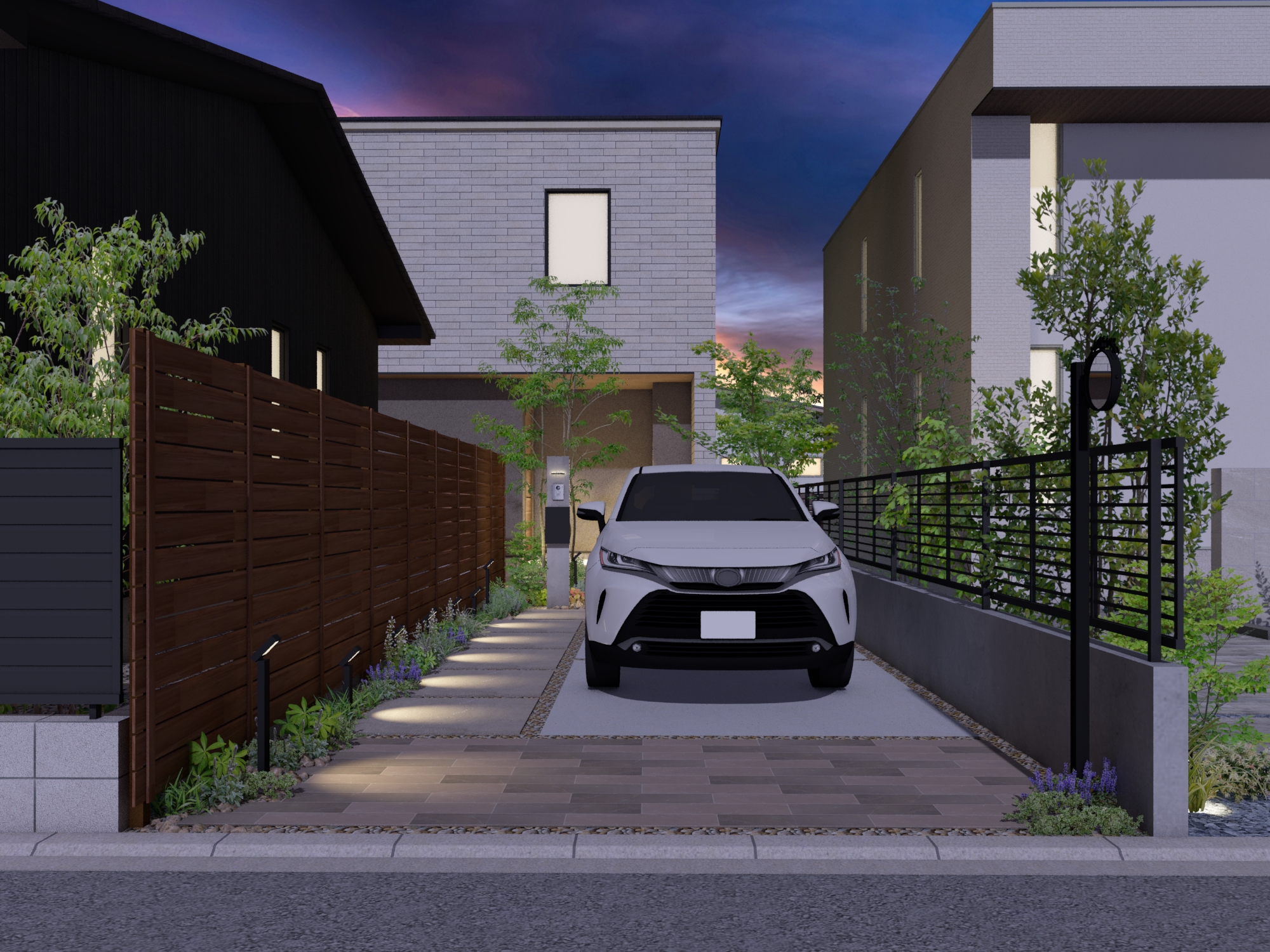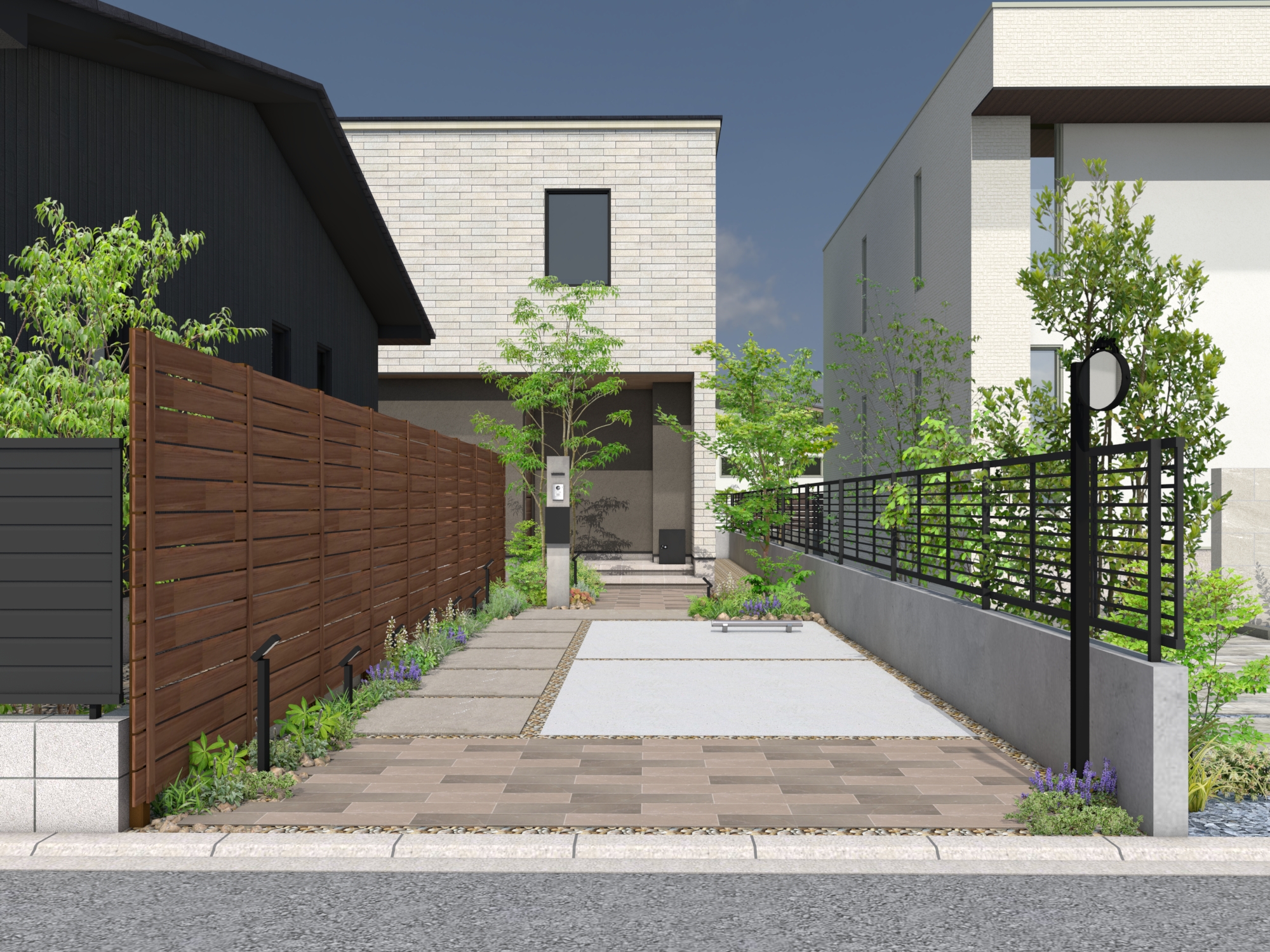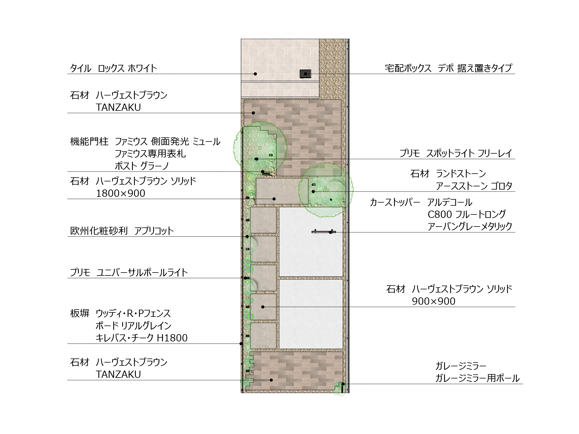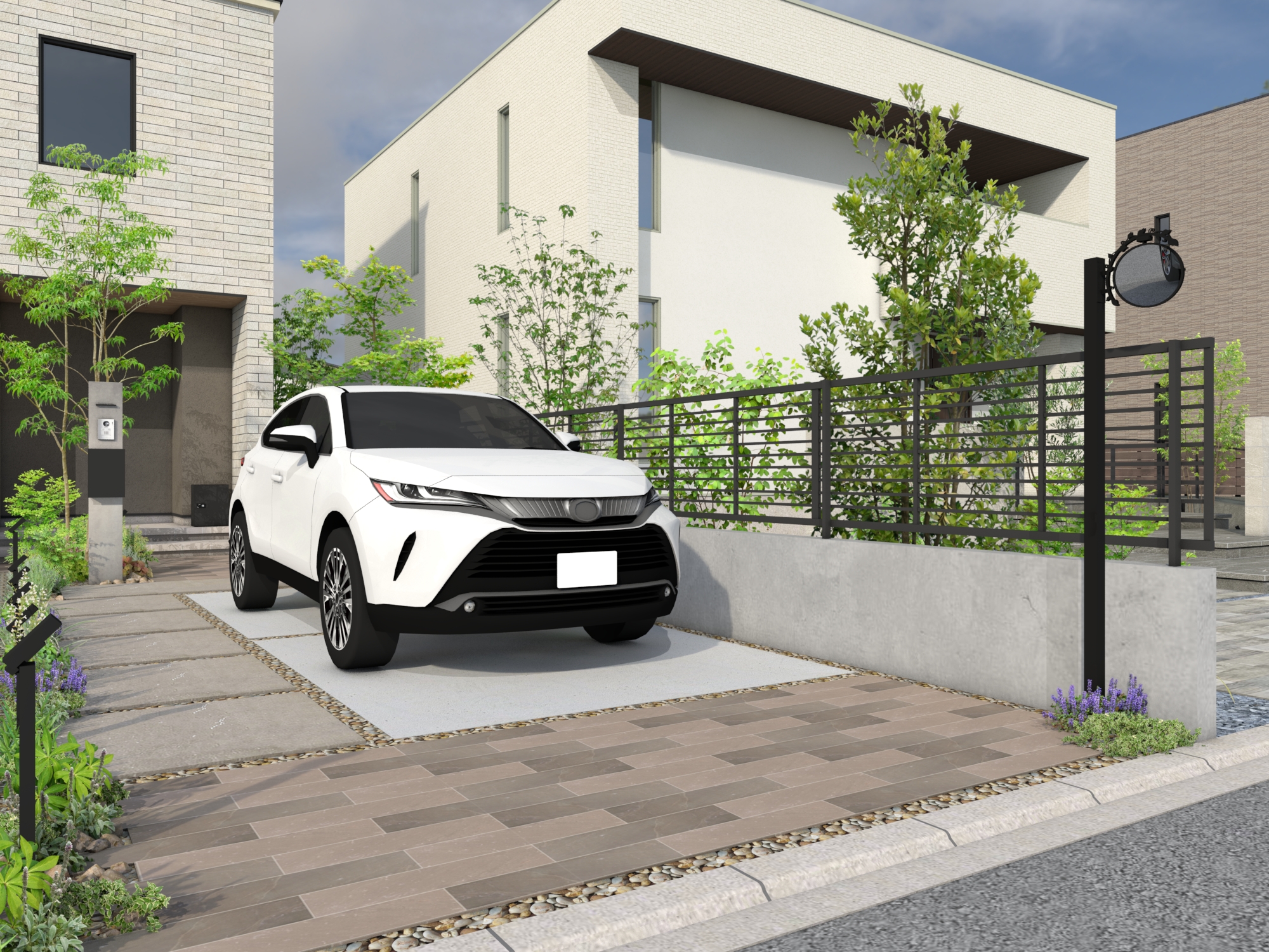 アプローチと車庫の間に石材アンチックイエローの飛石を入れて空間を仕切り、飛石の先はカラー立水栓とプラットパンヨスミを設置しました。