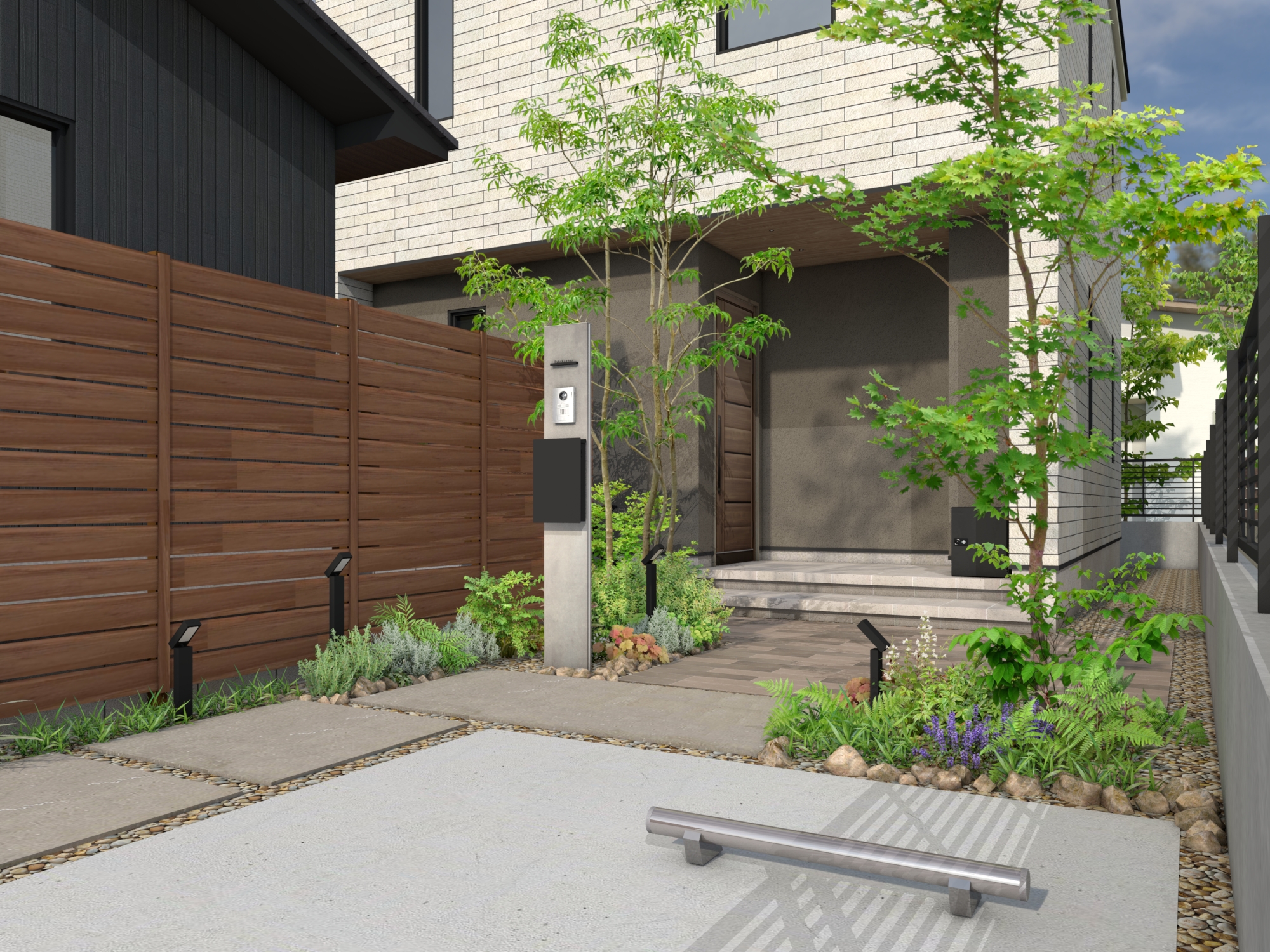 境界フェンスウッディエコフェンス2の隙間を大きく、個性的な小物には自然素材を合わせることで抜け感が出て、