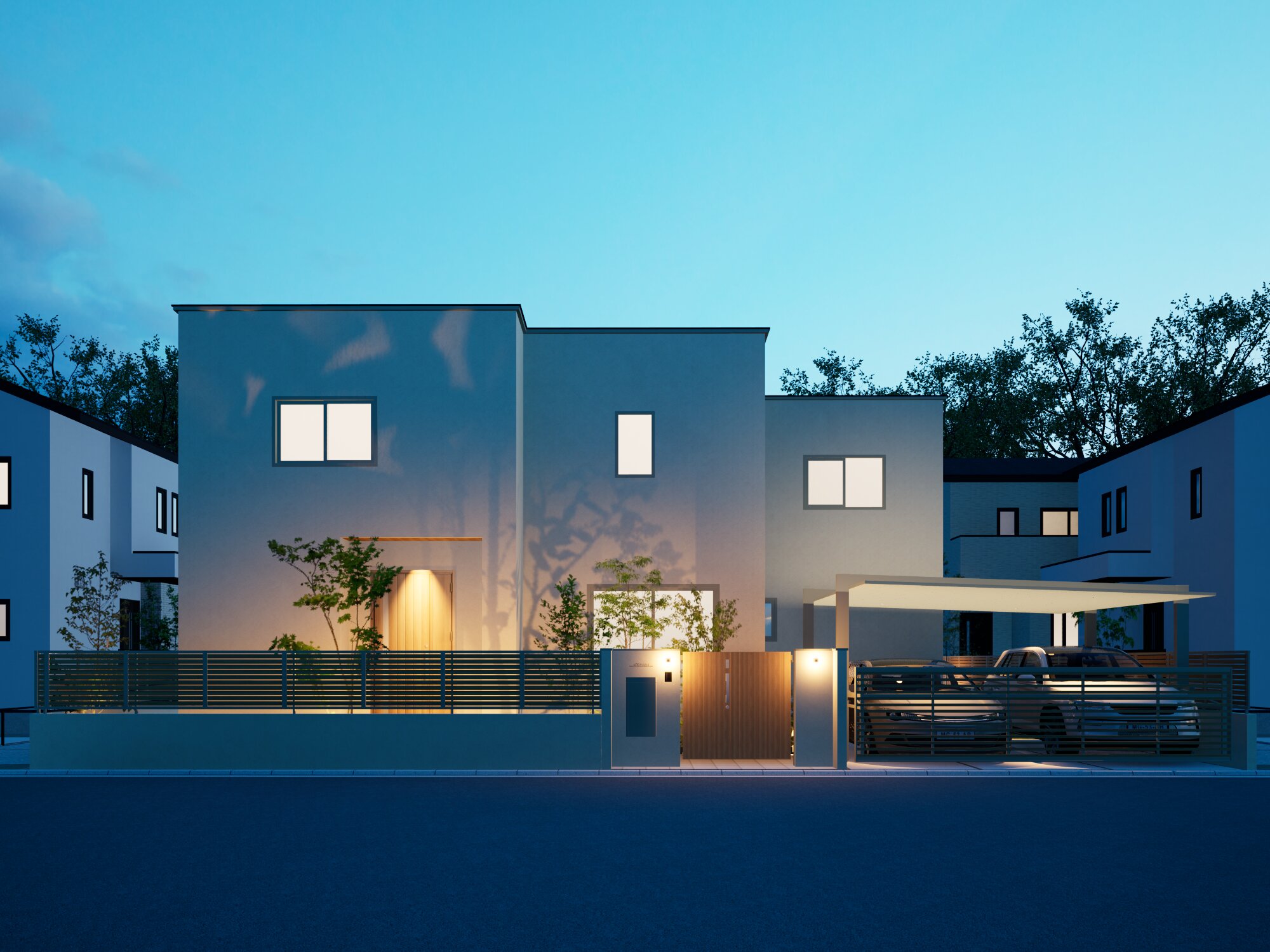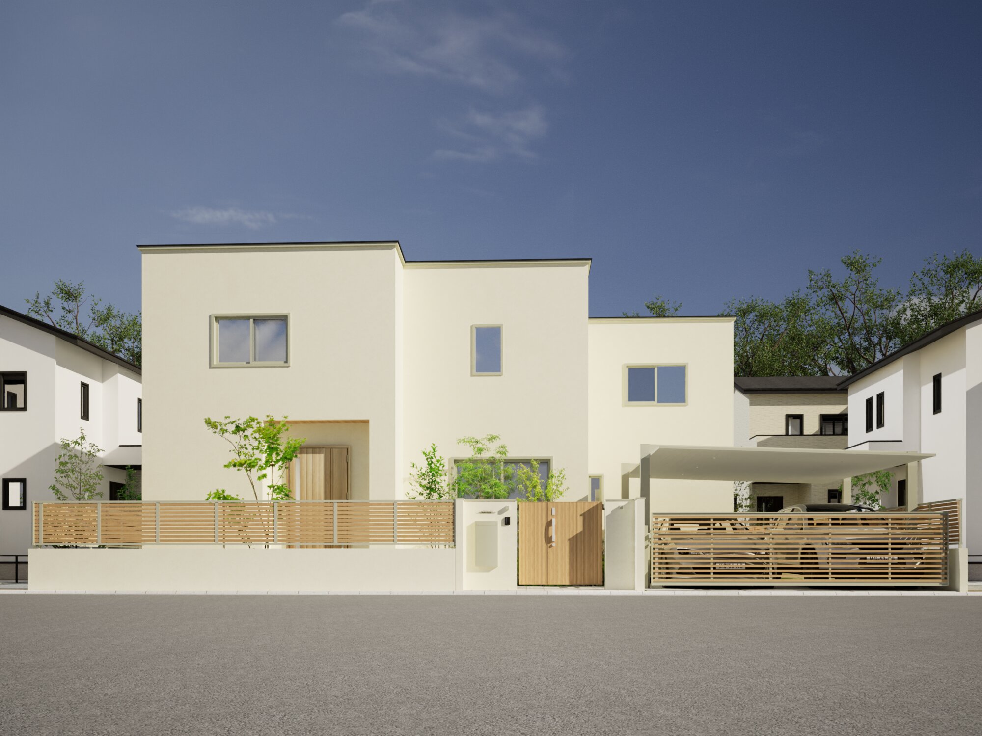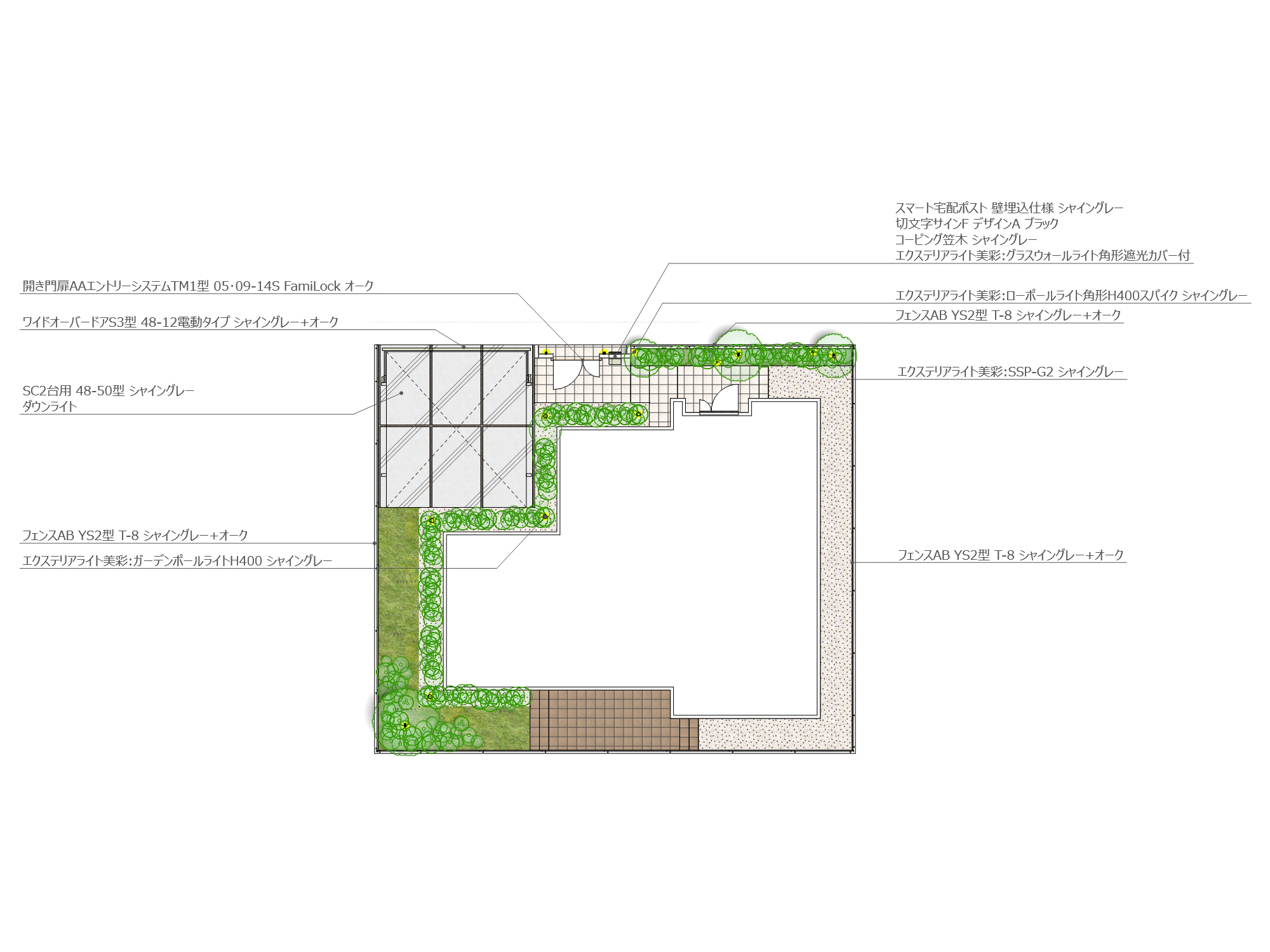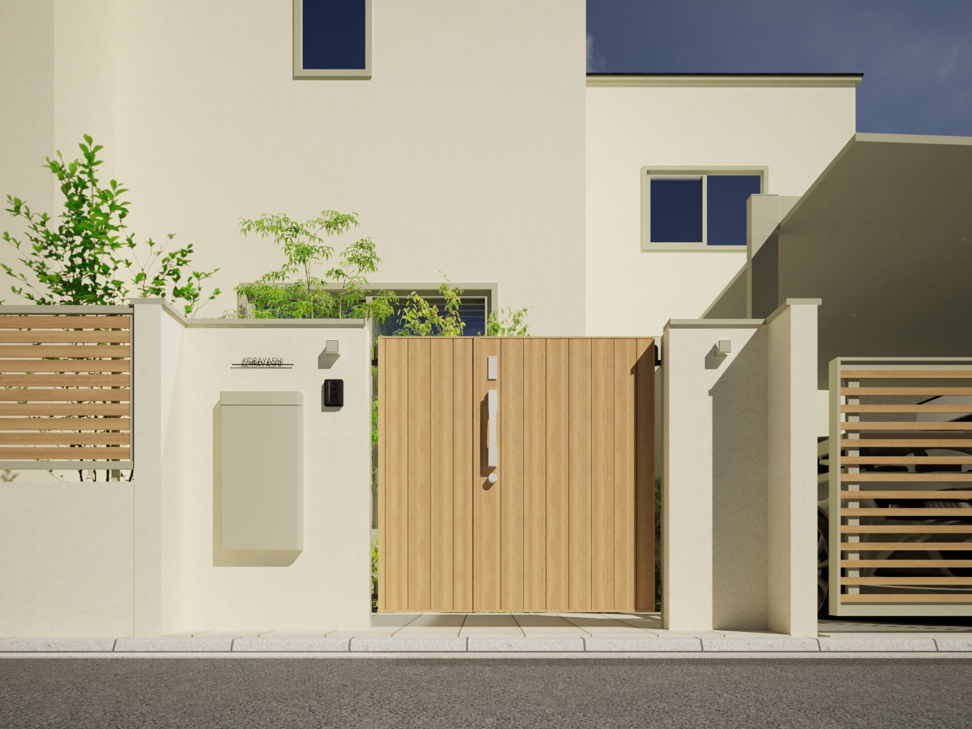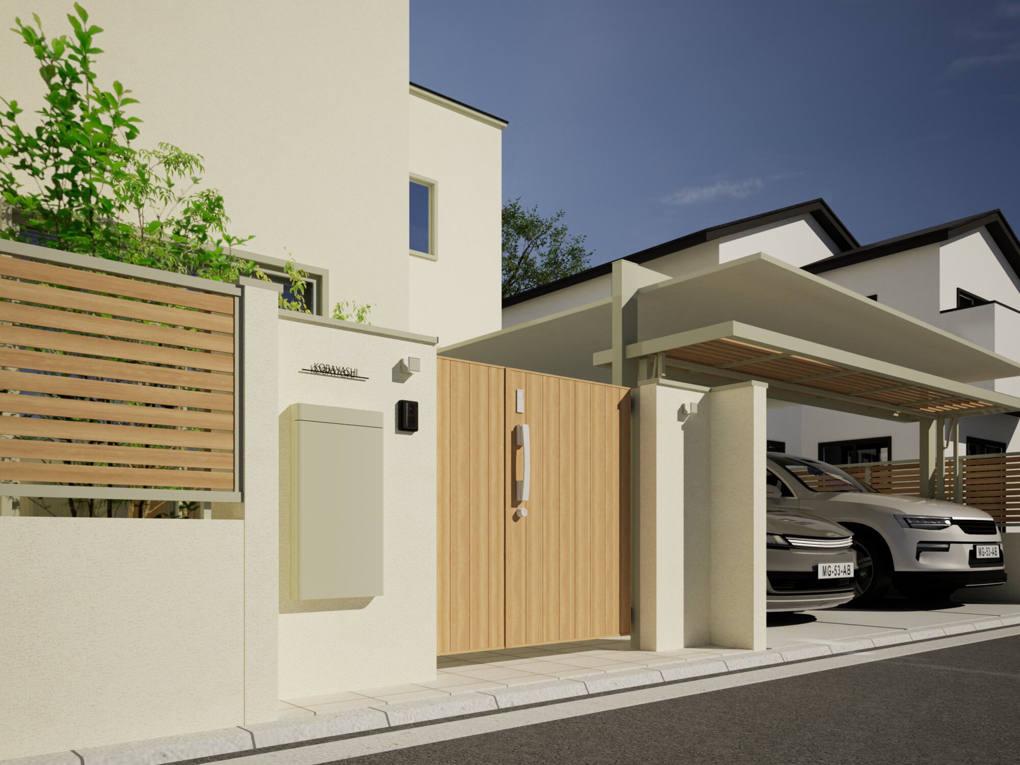 直昇タイプのオーバードアとスマートロックシステム「FamiLock」搭載の門扉AAを取り入れた、デザイン性と防犯性に優れたクローズプランです。