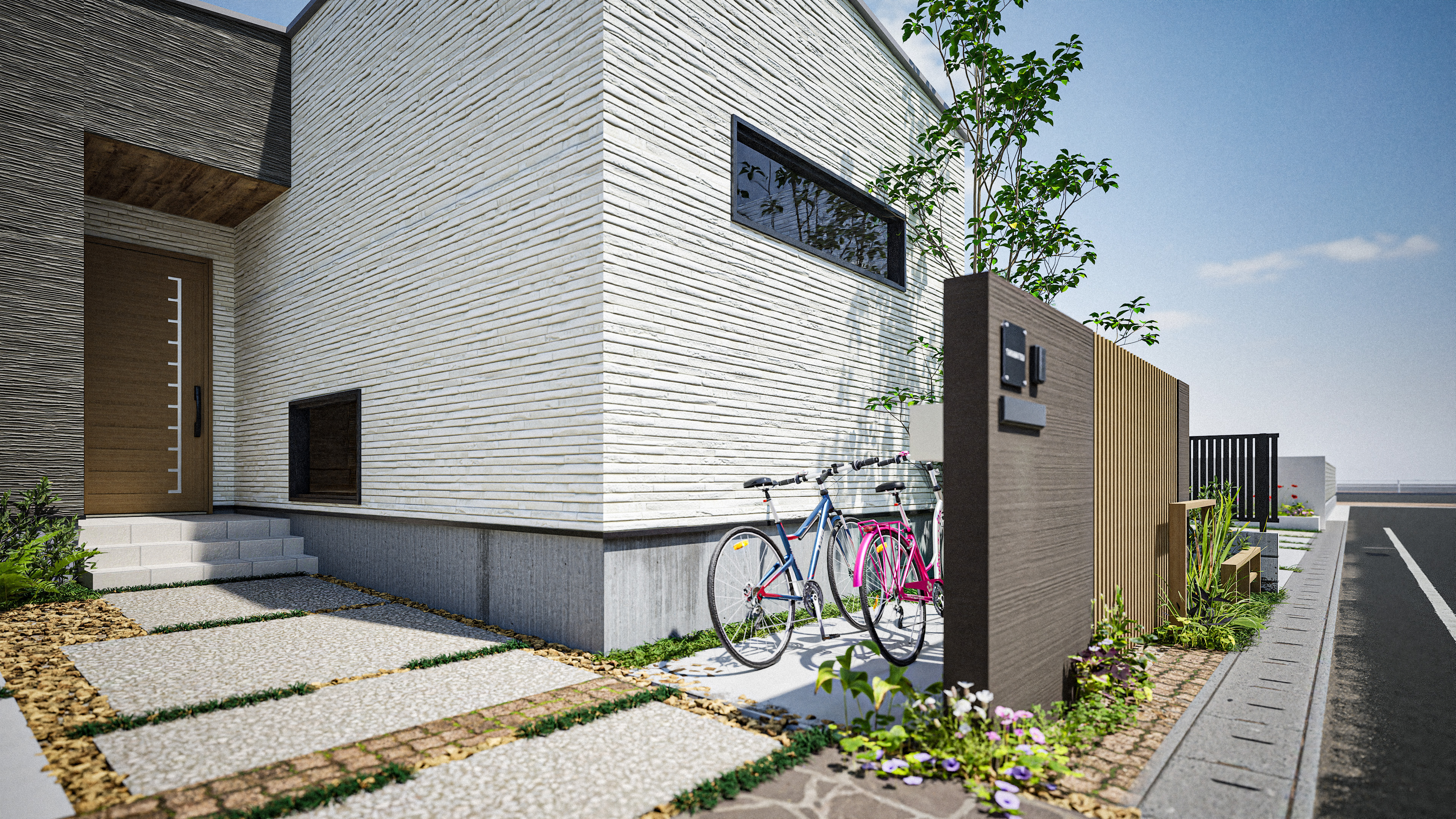 優しい色味の木調縦格子フェンスをアクセントにした門塀デザイン。