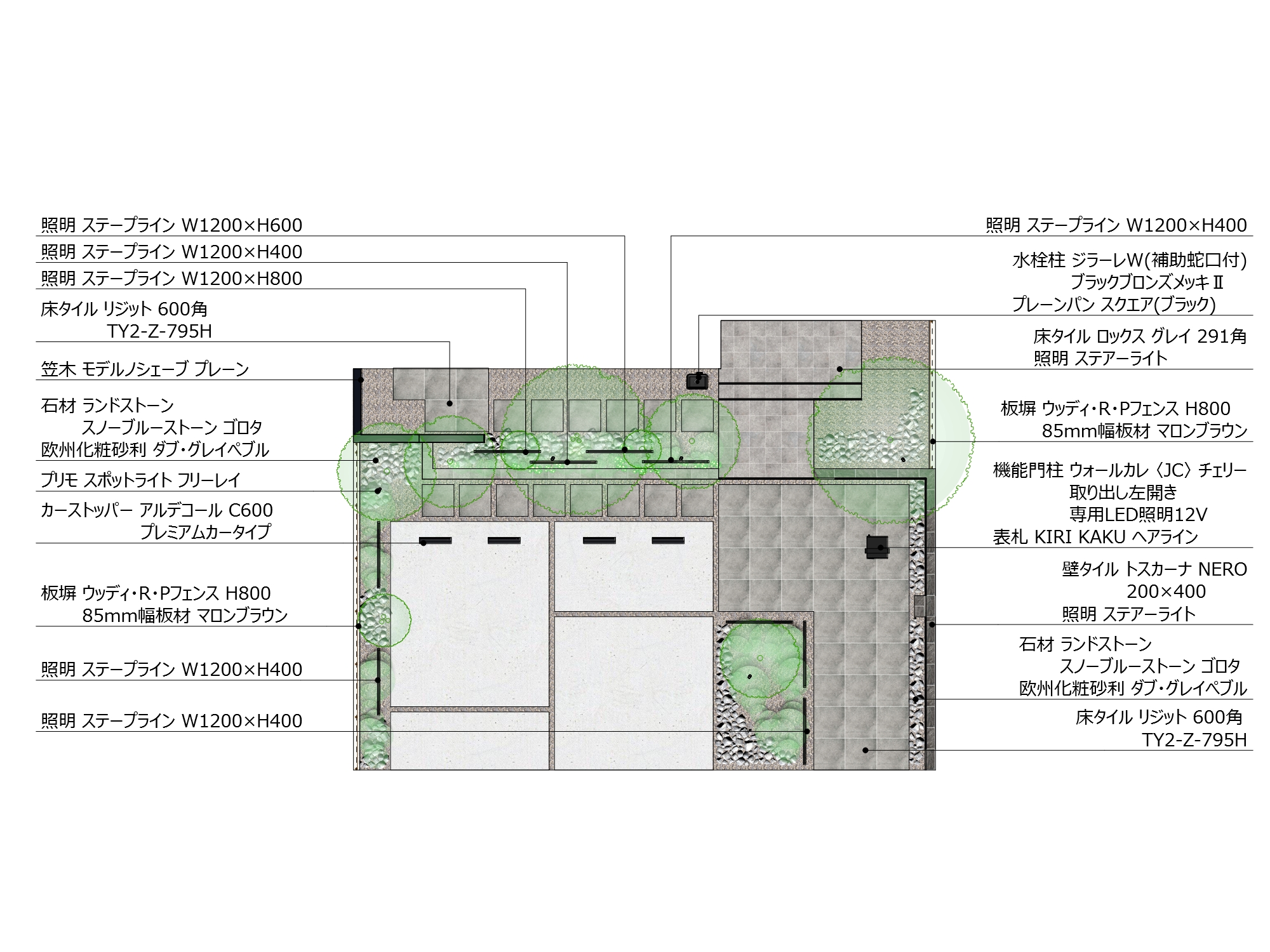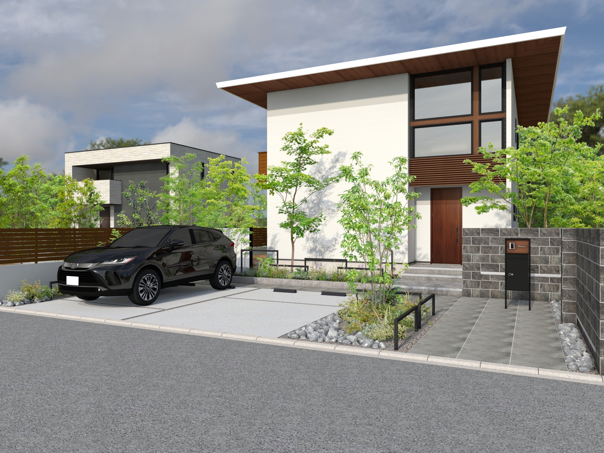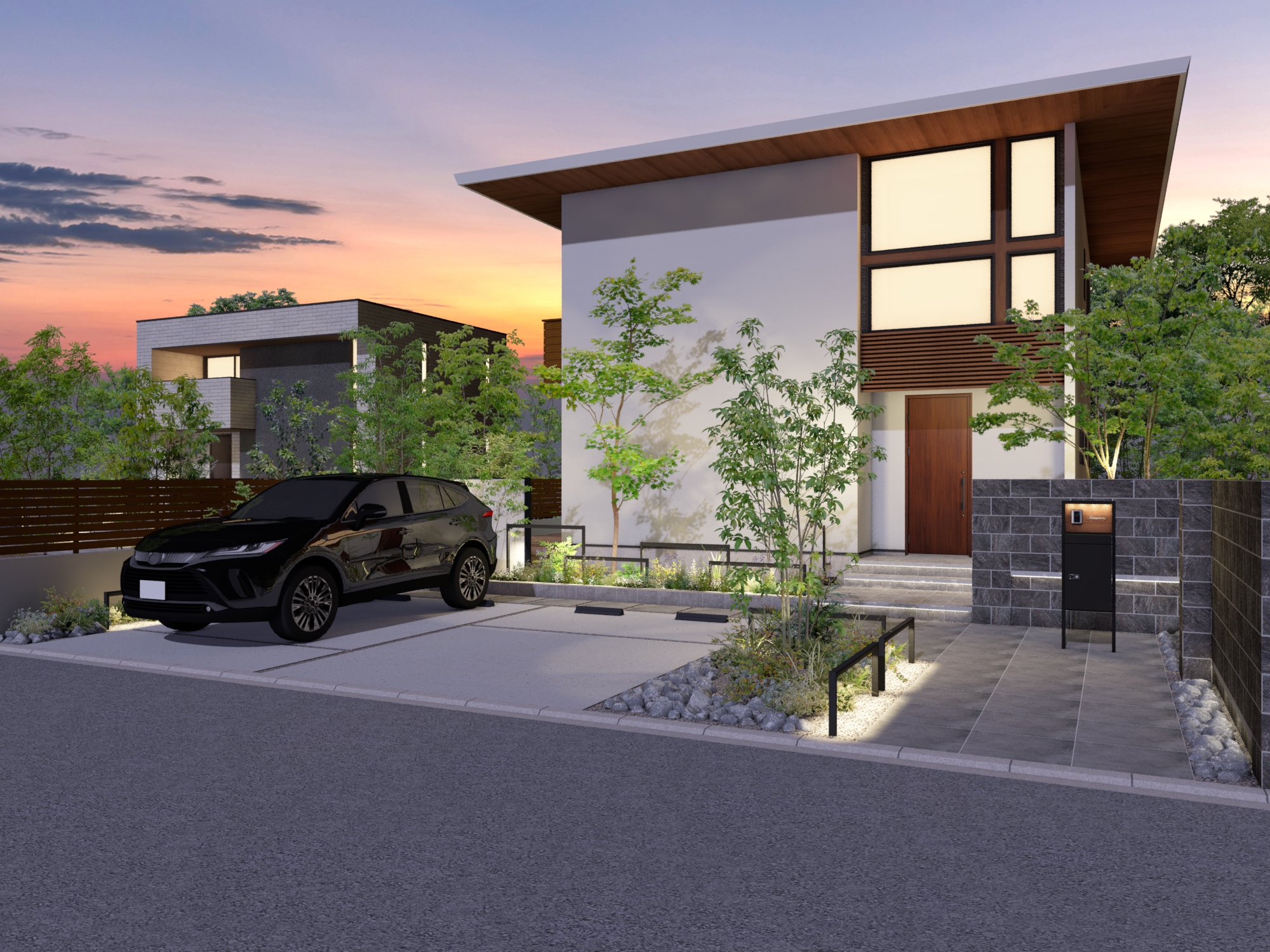 車庫や庭へのアプローチは飛石のように配置し、「ステープライン」を取り入れることでデザイン性を向上させるとともに、空間をさりげなく分けています。