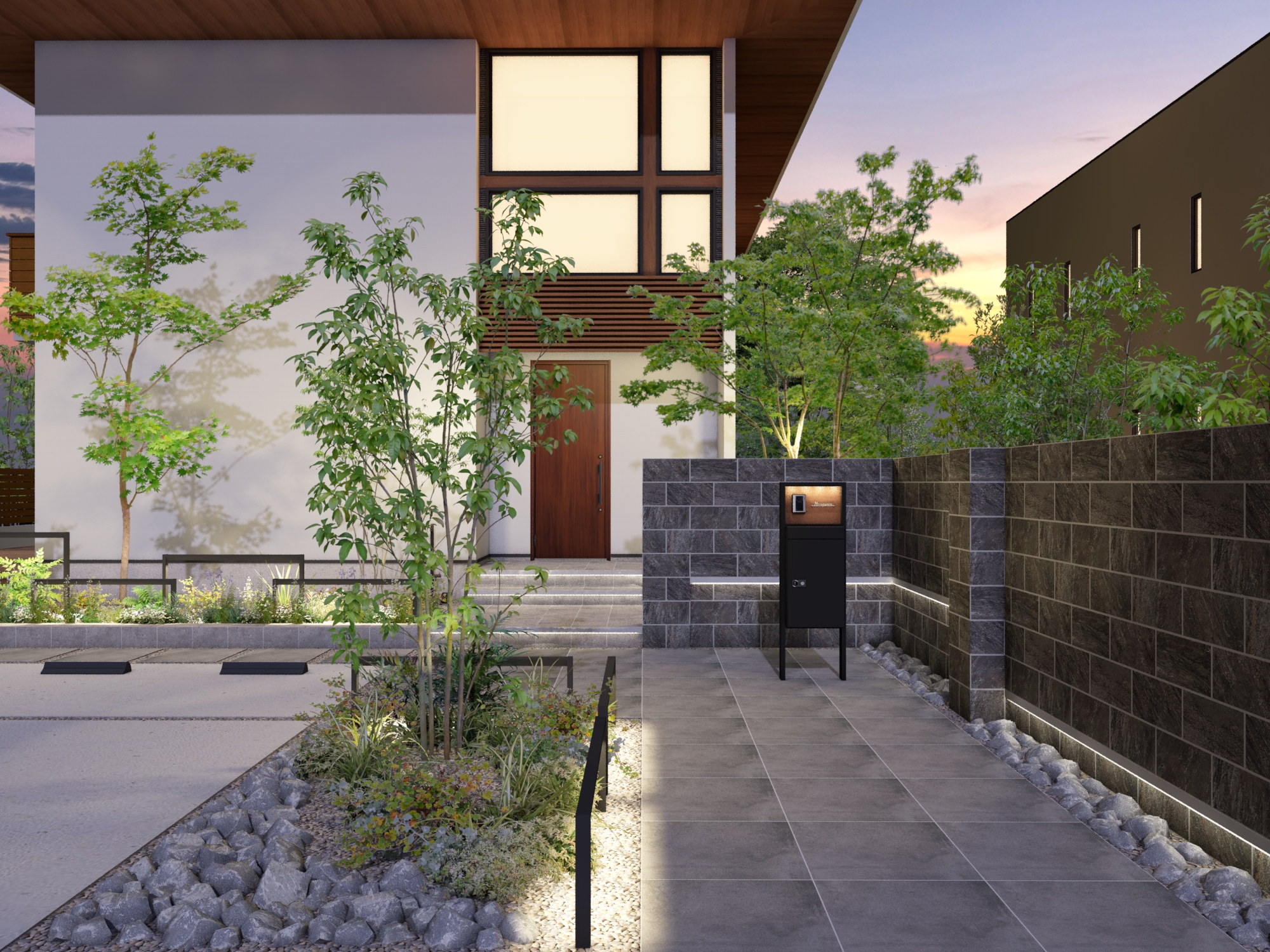 背面の壁には「ステアーライト」を埋め込み、設置高さを調整することでポスト周辺を効果的に照らし、