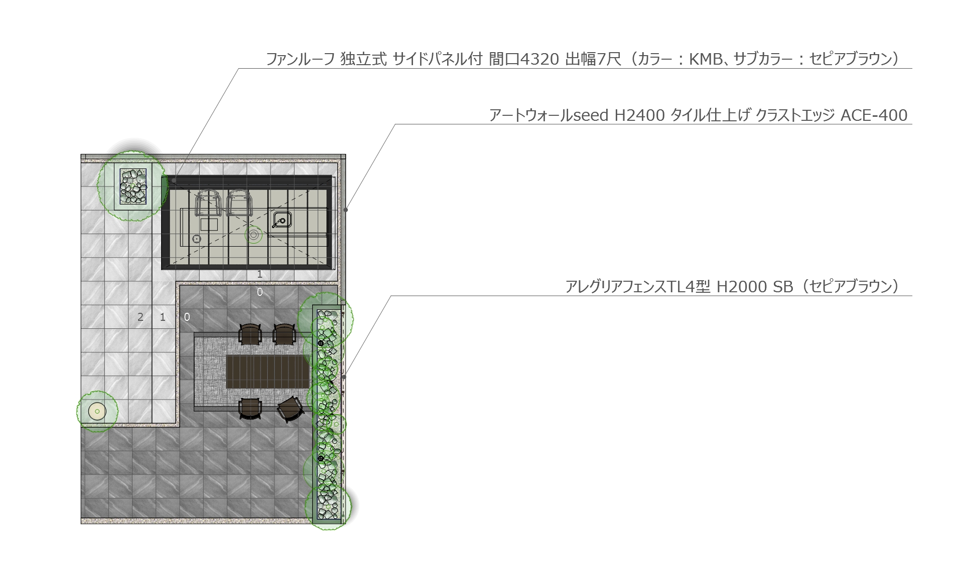 庭の中心には、アウトドアキッチンの屋根として**ファンルーフ 独立式(サイドパネル付)**を配置。