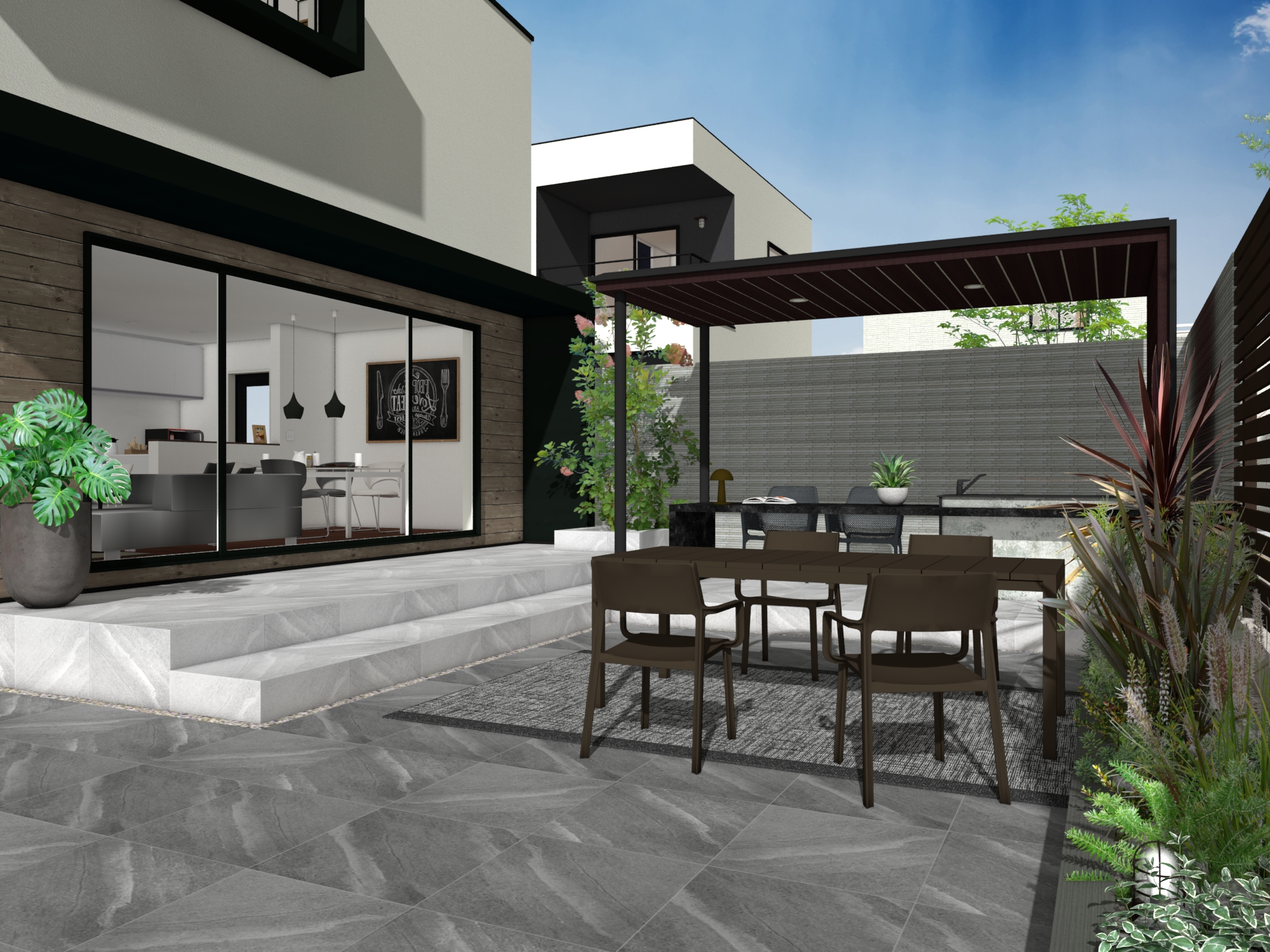 アウトドアキッチンやダイニングを備えた半屋外空間では、周囲からの視線制御と安全性の確保が空間の質を大きく左右します。アートウォール seed は、十分な高さと堅牢な構造を備えており、プライバシーを確保しながらも、外構全体に安心感をもたらす境界要素として機能します。