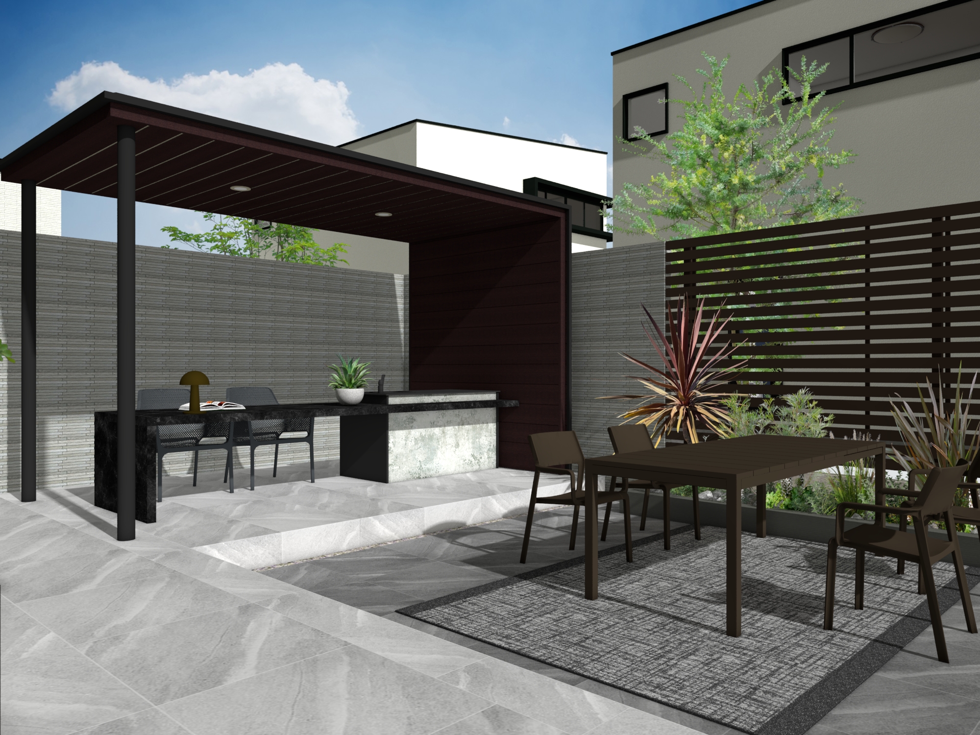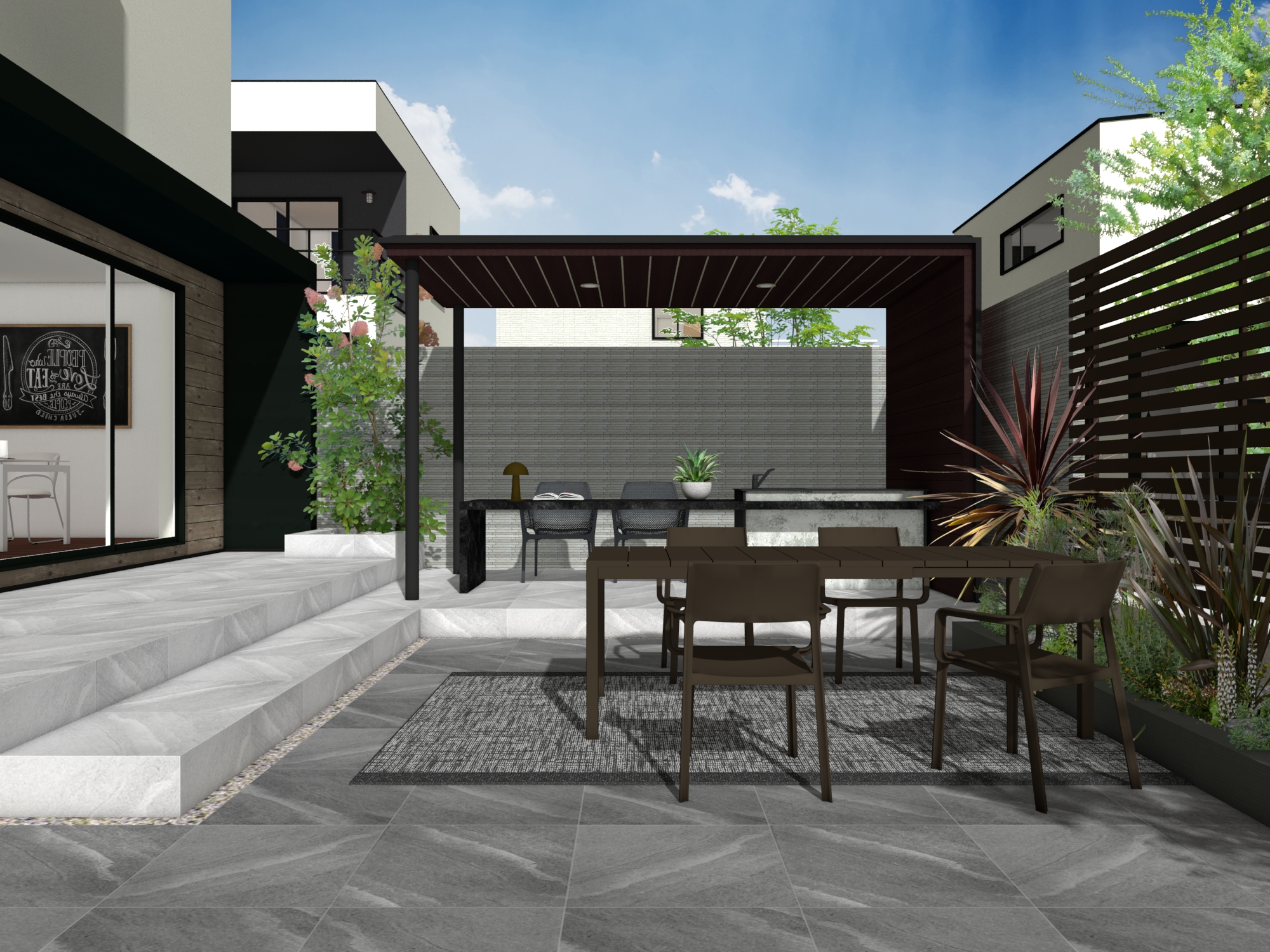 建築から独立させることで、室内外の動線を曖昧にせず、外構空間そのものを一つの“部屋”として成立させています。サイドパネルにより、周囲からの視線を適度に遮りながらも、完全に閉じないことで抜け感と開放感を確保。日常の延長として使える半屋外ダイニングを形成しています。