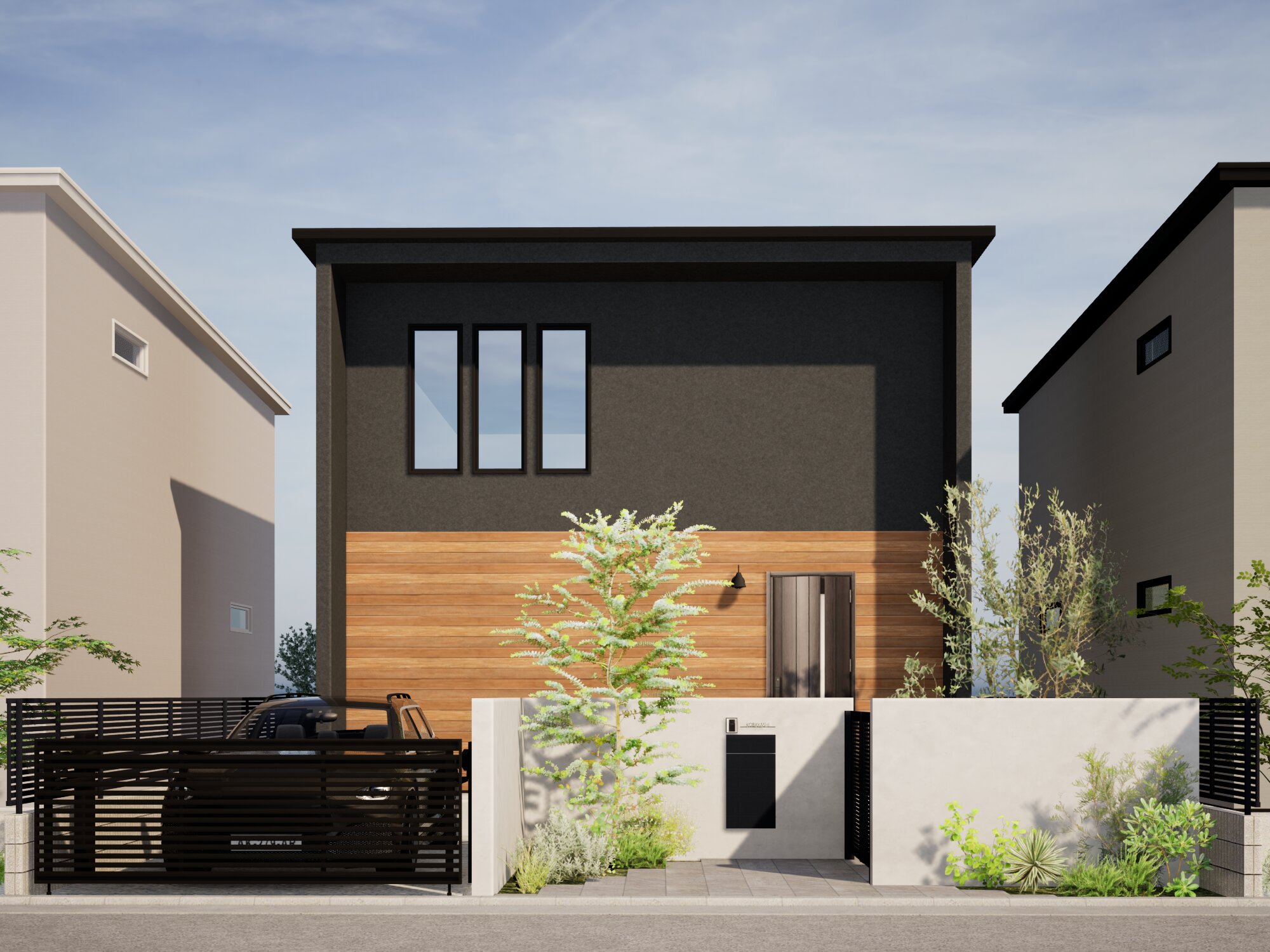 アプローチをクランクさせることで歩く人の目線を振る効果があり、植栽や門袖がアイストップとなるので変化に富んだファサード空間となります。