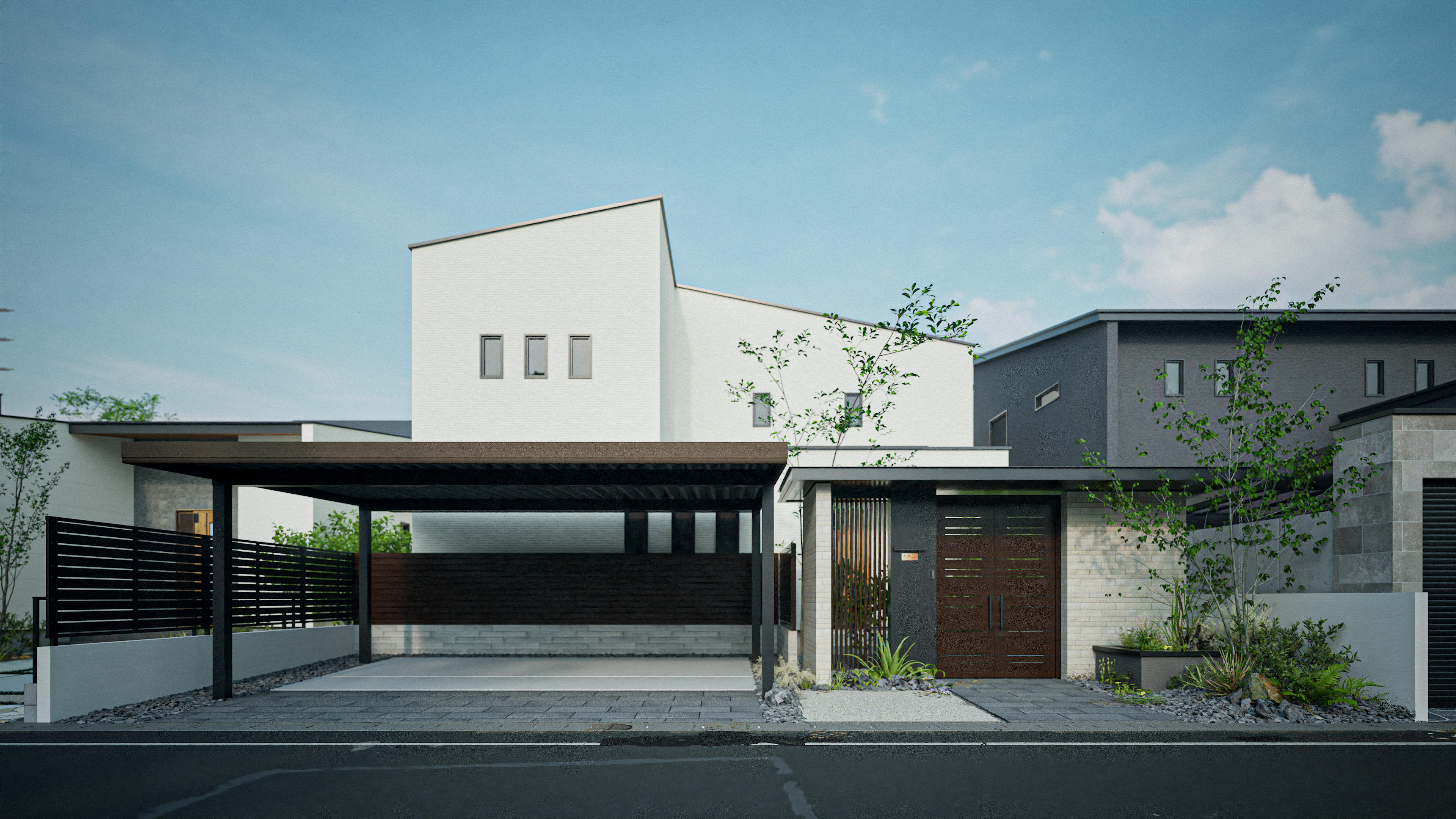 水平ラインを基調としたファサードデザインと縦格子をアクセントにした和モダンデザイン。