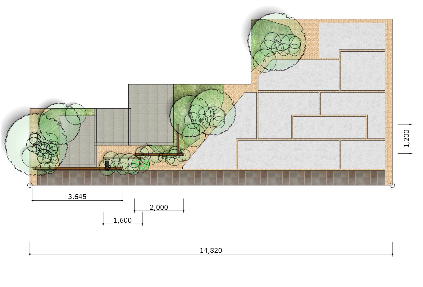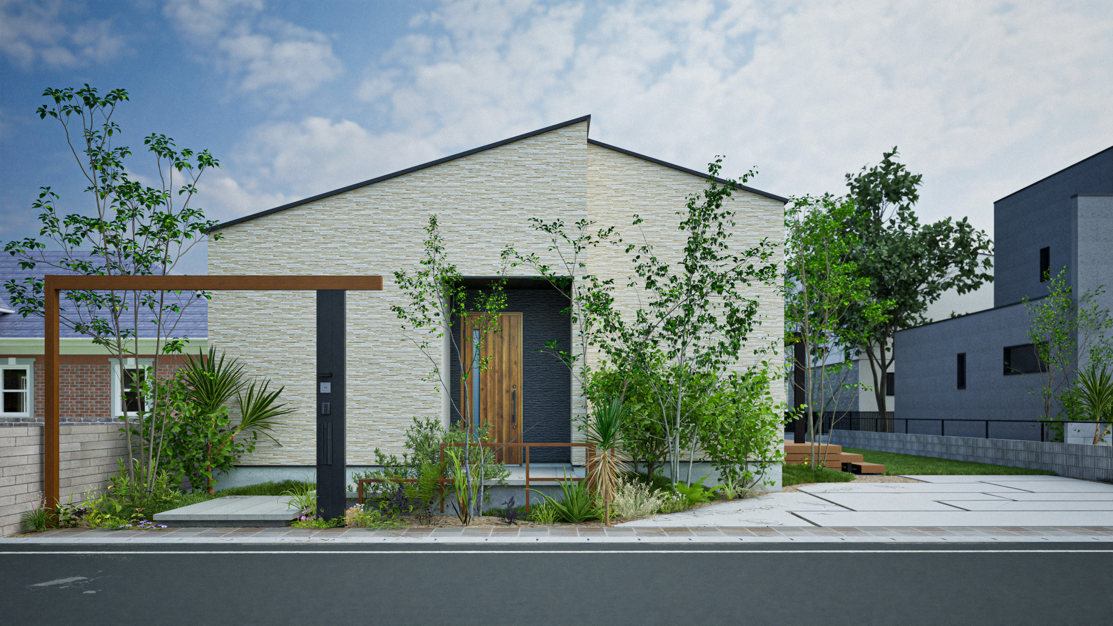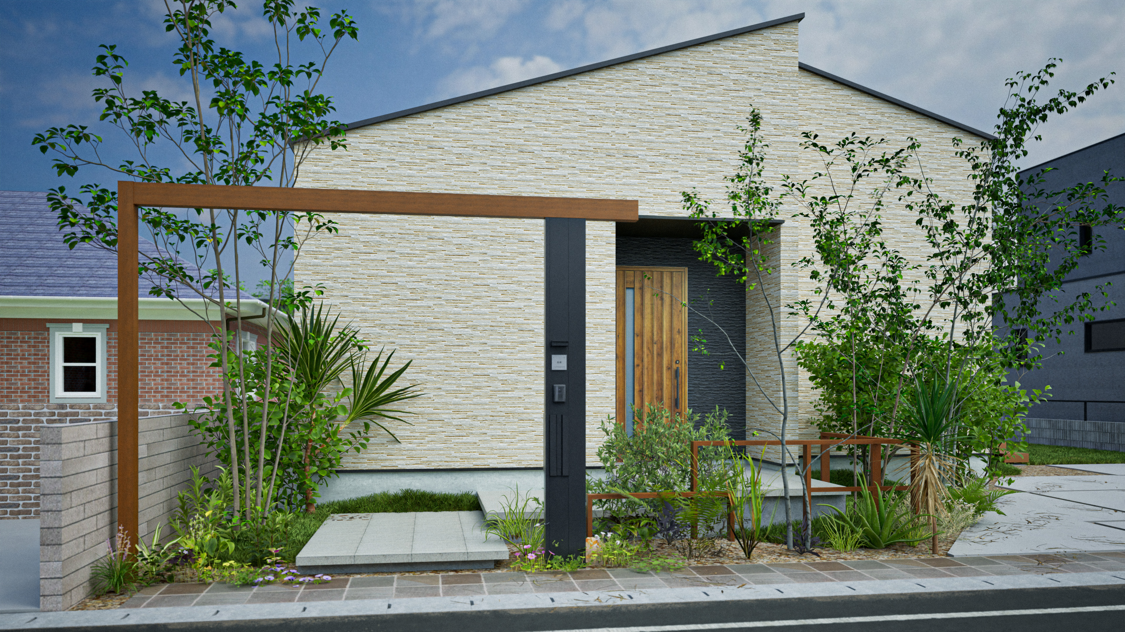 L字の木調がアクセントになった機能門柱と一体のゲートを設えたシンプルなデザイン。