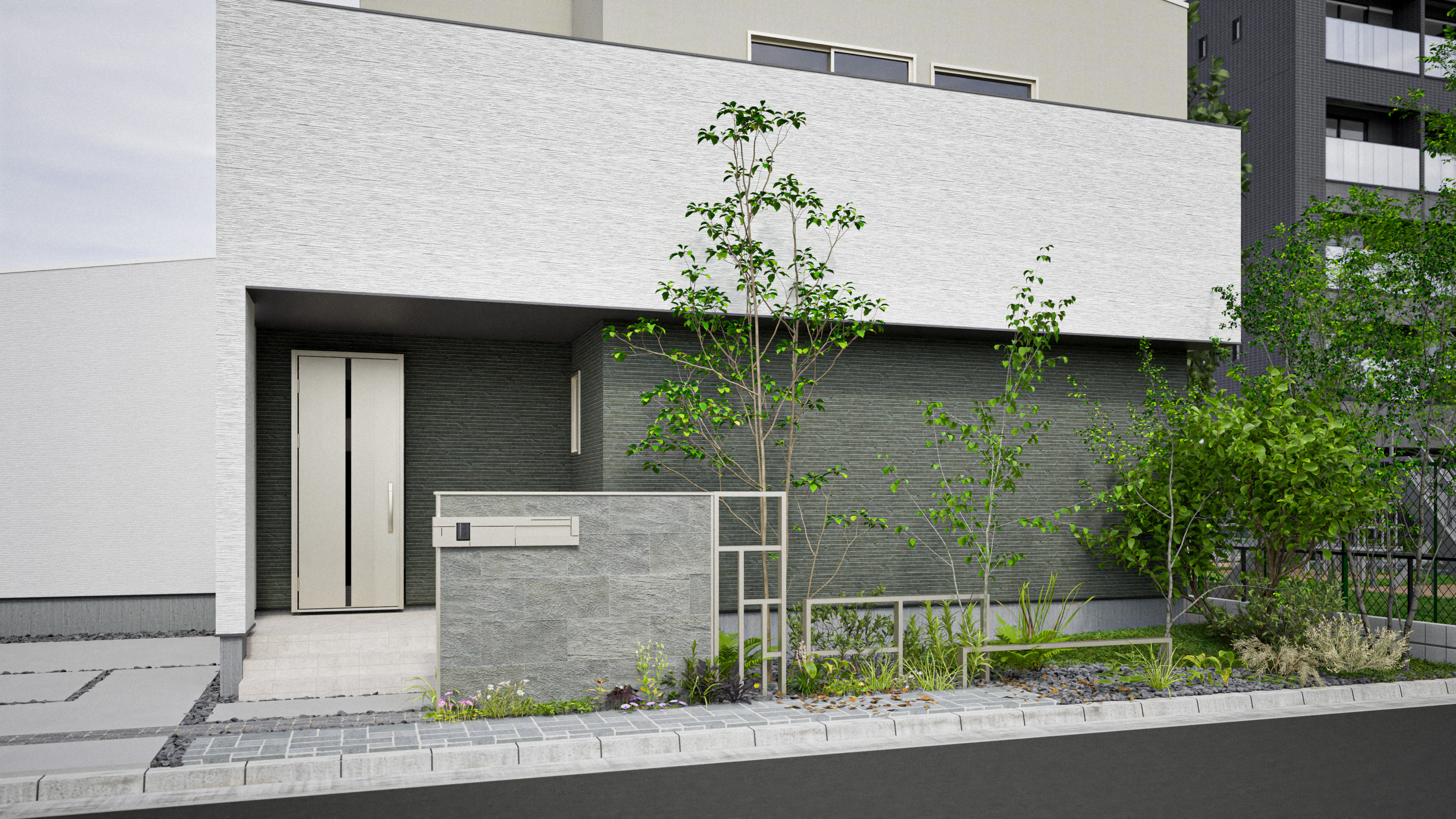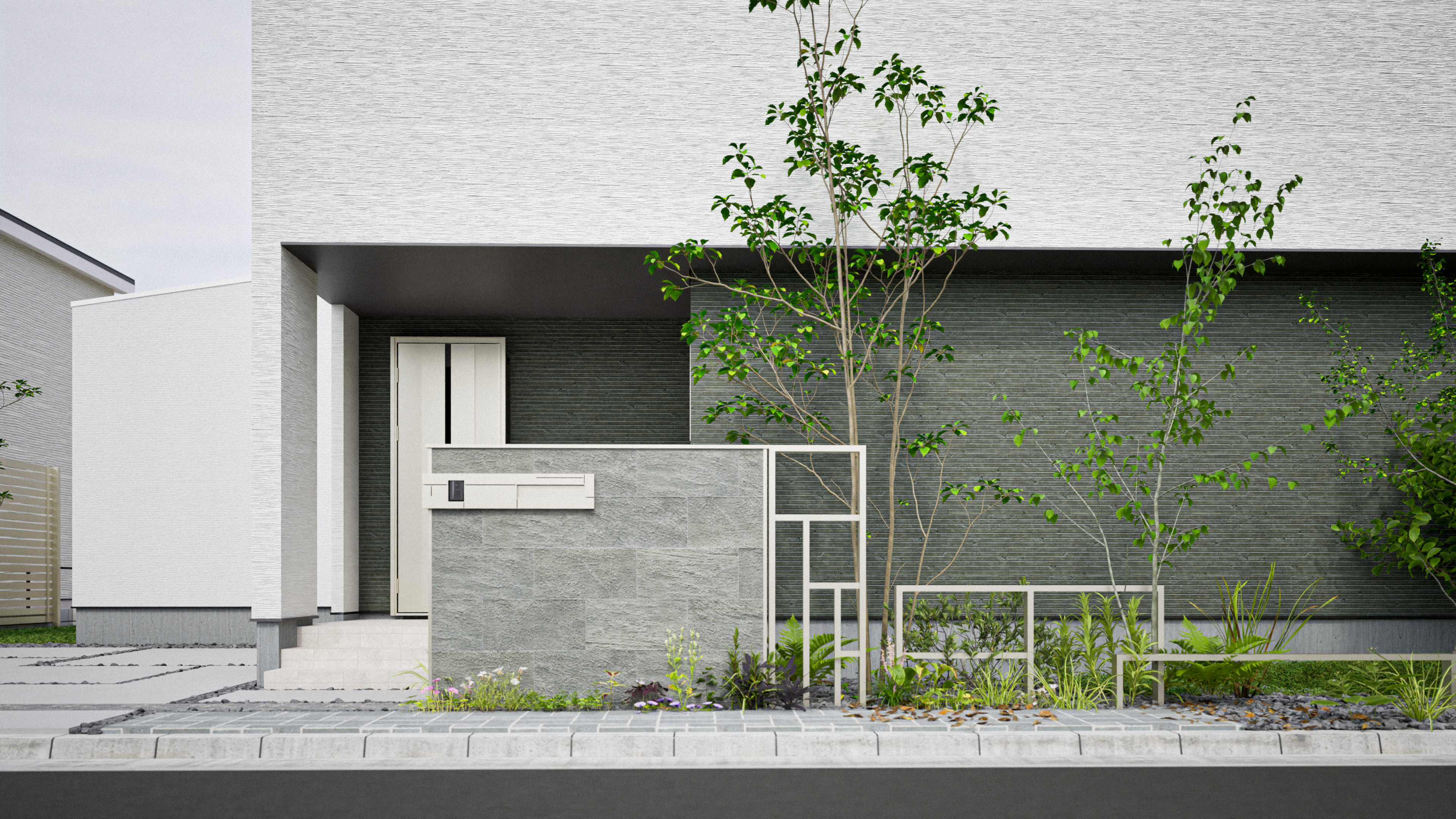 【使用商品】 ・リレーリアウォール(タイル仕上げ) ・プリュード インターホンカバーYS02 ・プリュード パーティションフレームユニットA型 ・プリュード パーティションフレームユニットA01型 ・プリュード ウォールフレームユニットK03型 ・エクステリアポストG3型
