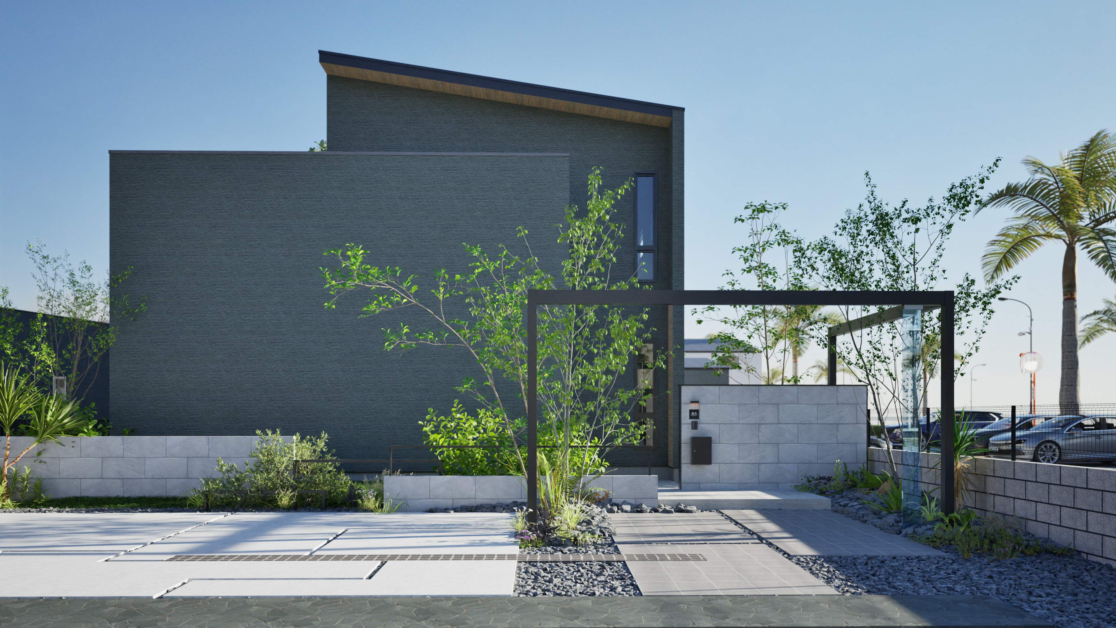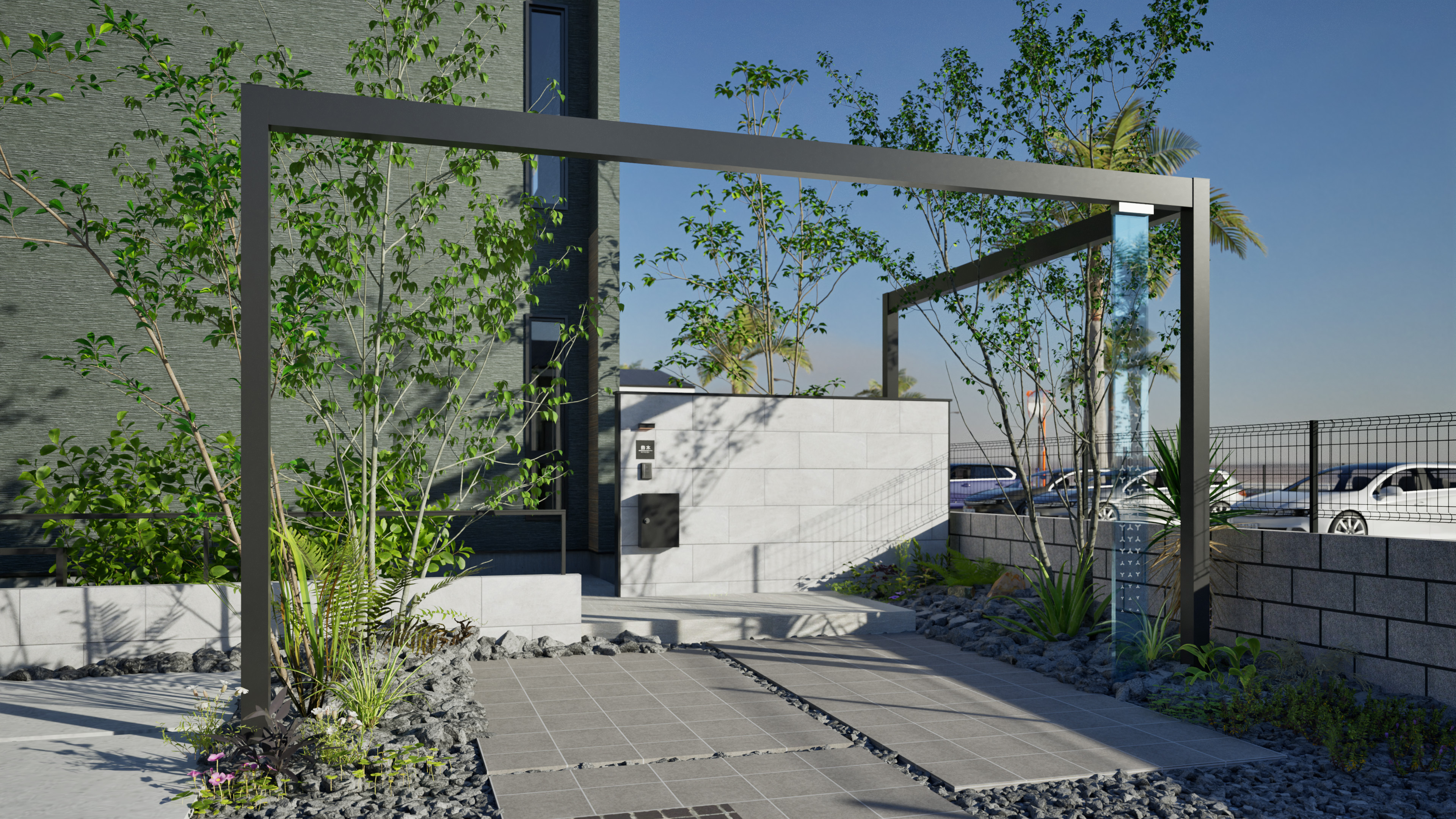 アルミのシャープなゲートフレームと石目調のタイル、ガラススクリーンをアクセントにした異なる素材を組み合わせたモダンなファサードデザイン。