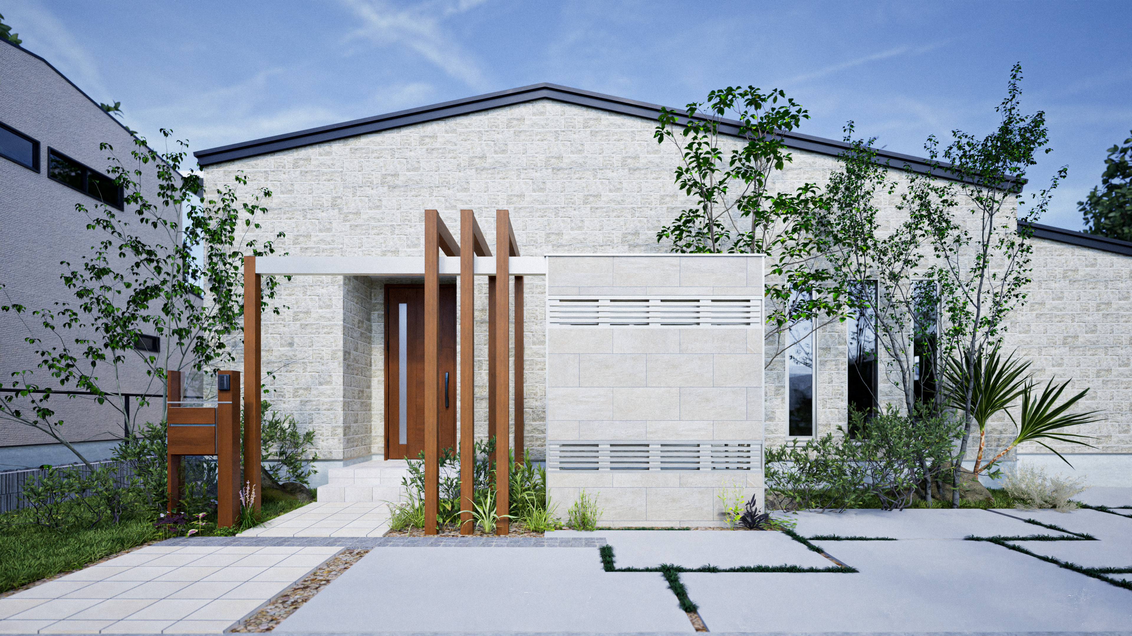 プライバシーと通風を両立するスリットウォールとゲートを組みわせたアプローチと一体感のあるファサード。