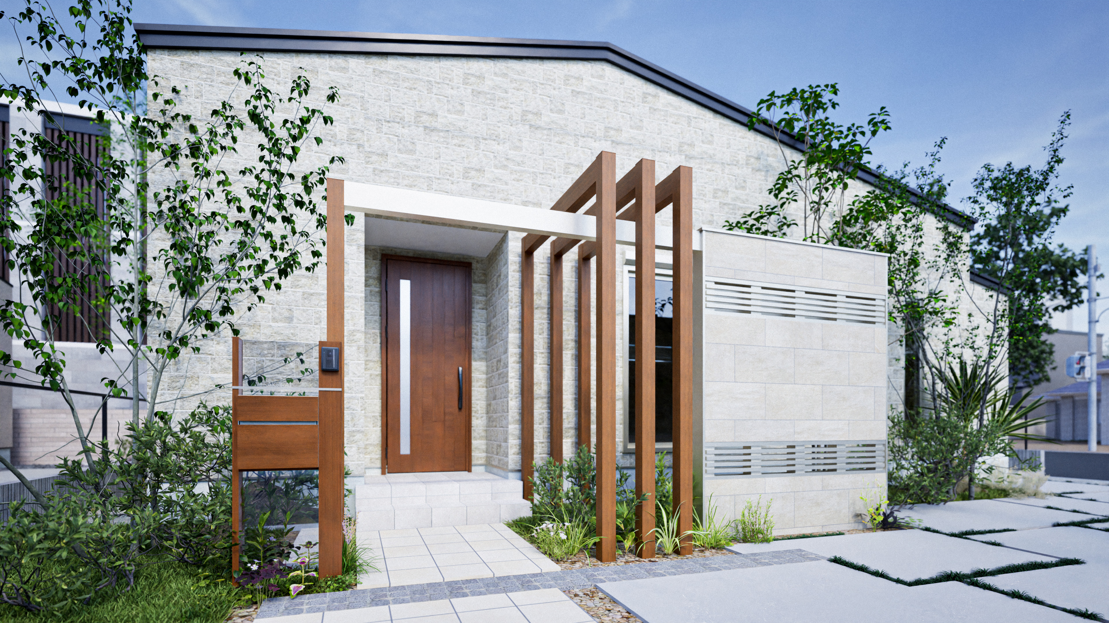 【使用商品】 ・リレーリアフロントフレーム ・リレーリアウォール(タイル仕上げ) ・ルシアスポストユニットPD01型 ・ルシアスフェンスLiteA01型