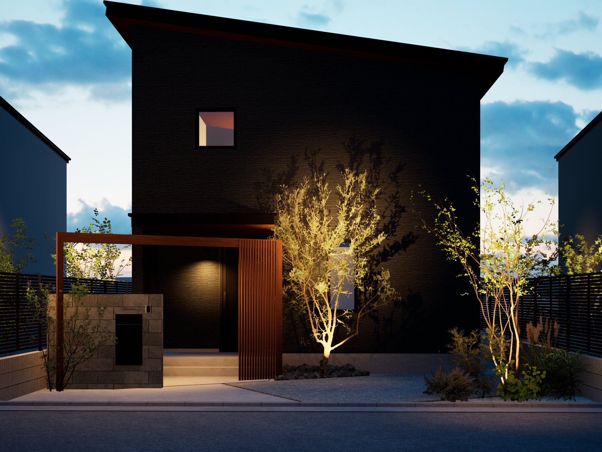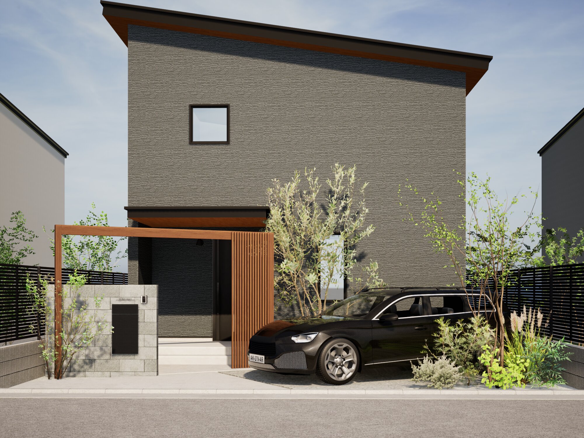 斜めに配置したプラスG木調色のアーチがフォーカルポイントとなり、門袖や縦格子を重ねることで奥行きを感じることができます。