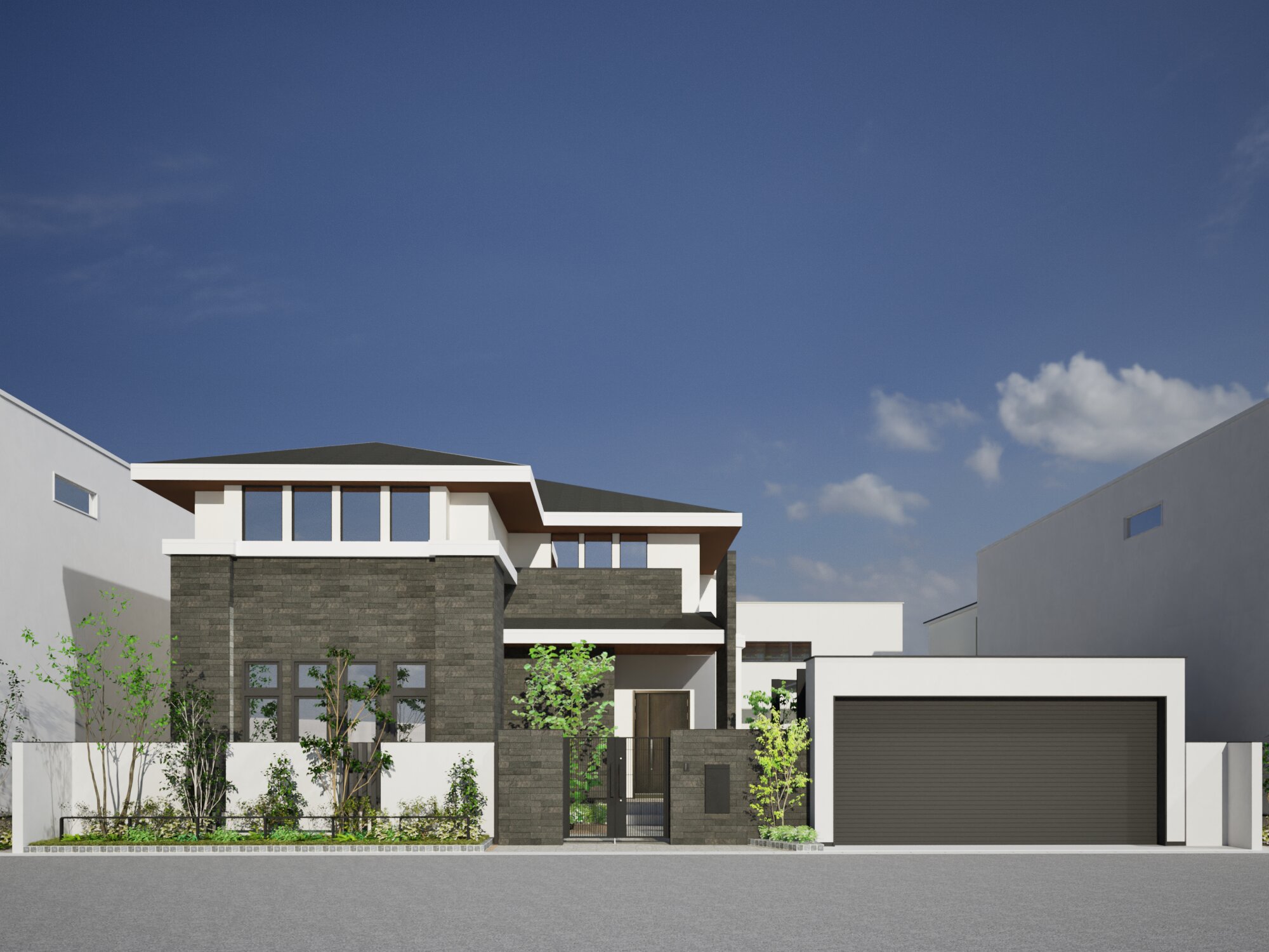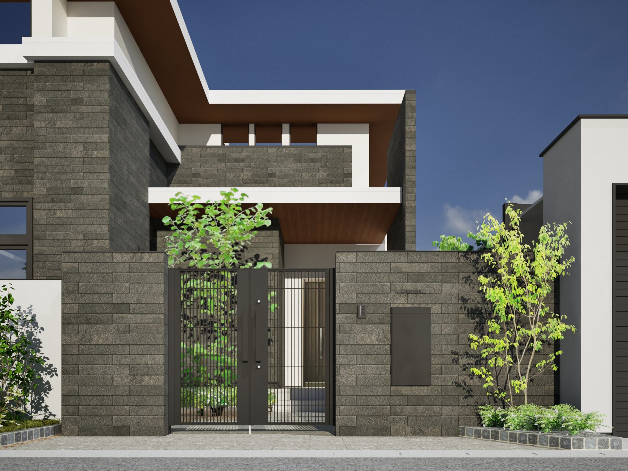 直線的な構成と素材の質感が織りなす、気品と安心を兼ね備えたラグジュアリーなエクステリア空間です。